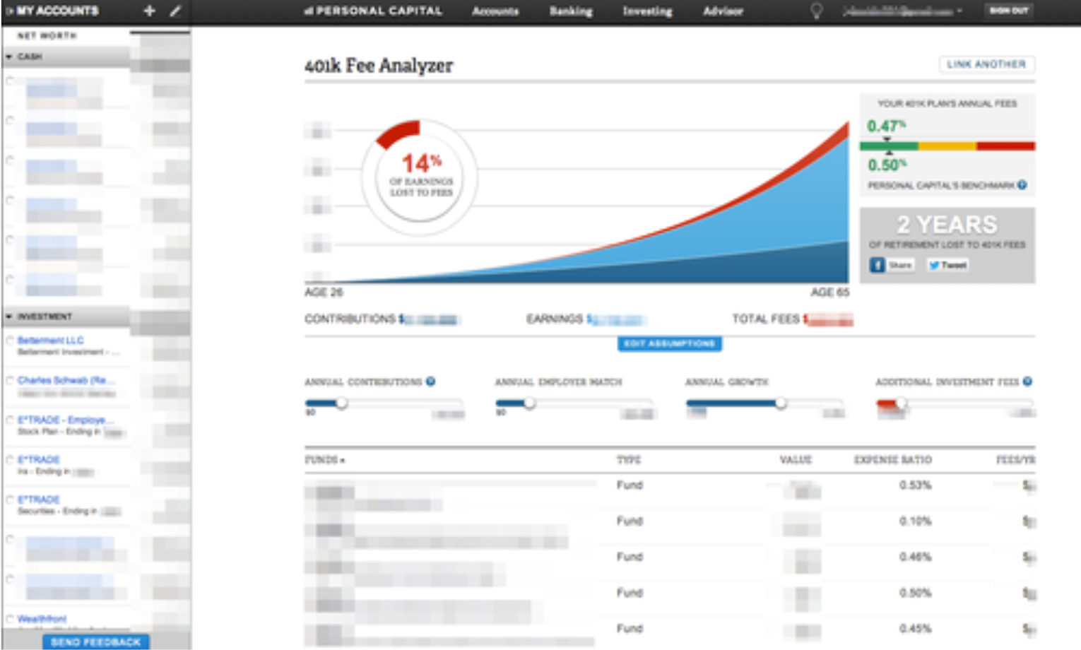 - Connected my accounts (and my wifes) to Personal Capital to help me understand what expenses are associated with funds I’m invested in, and how many years of retirement I could be wasting. Does a great job of showing our entire portfolio.