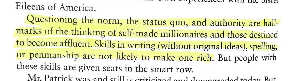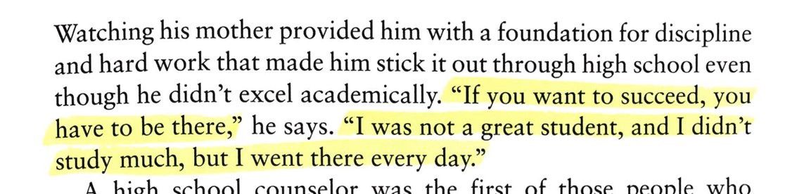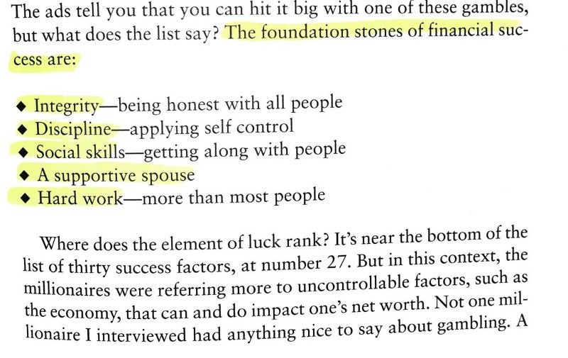 The book highlights a lot of survey results re: millionaires such as GPA (2.9/4.0), SAT scores (1190/1600), and the ability to always show up.