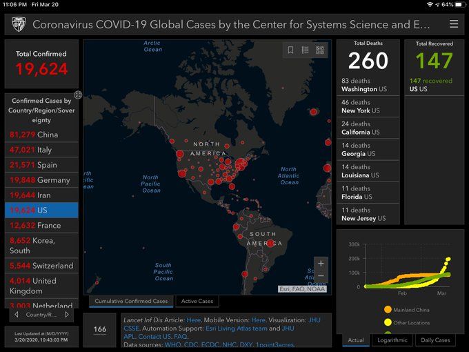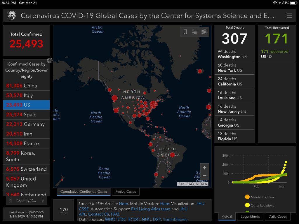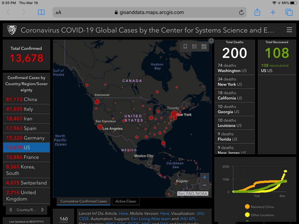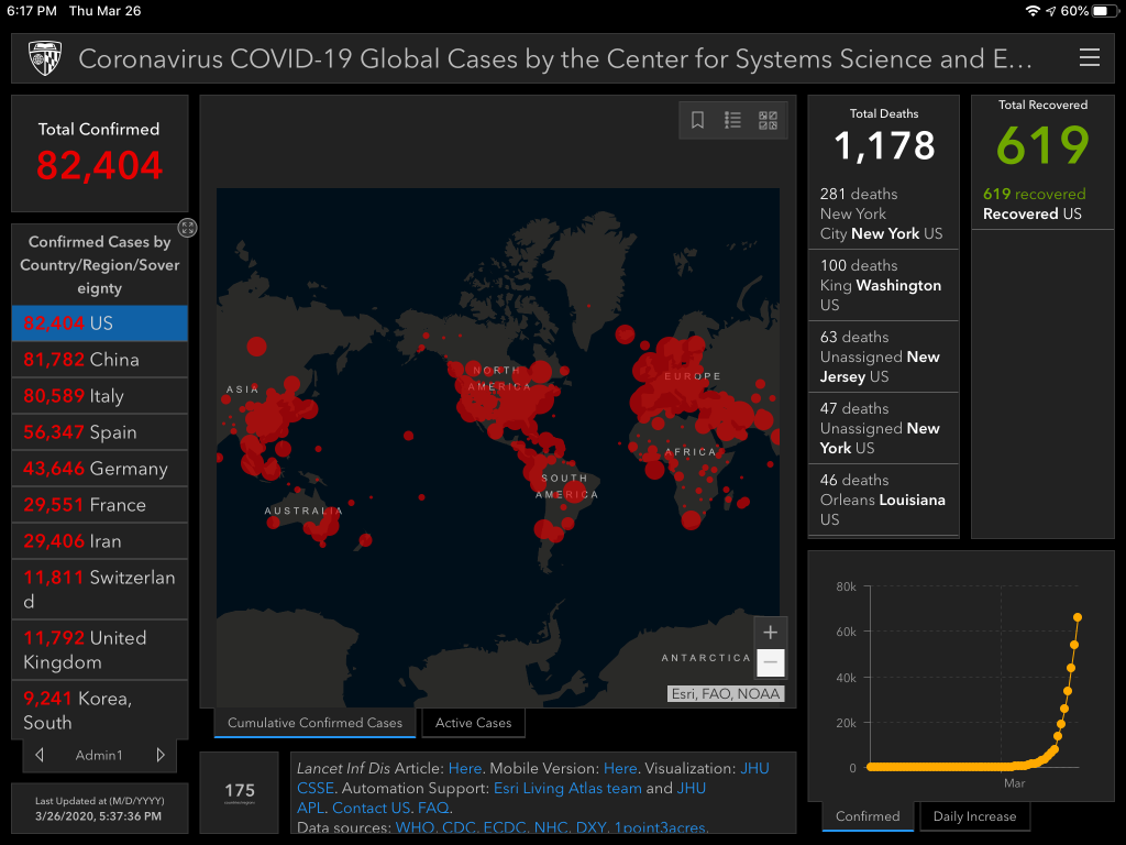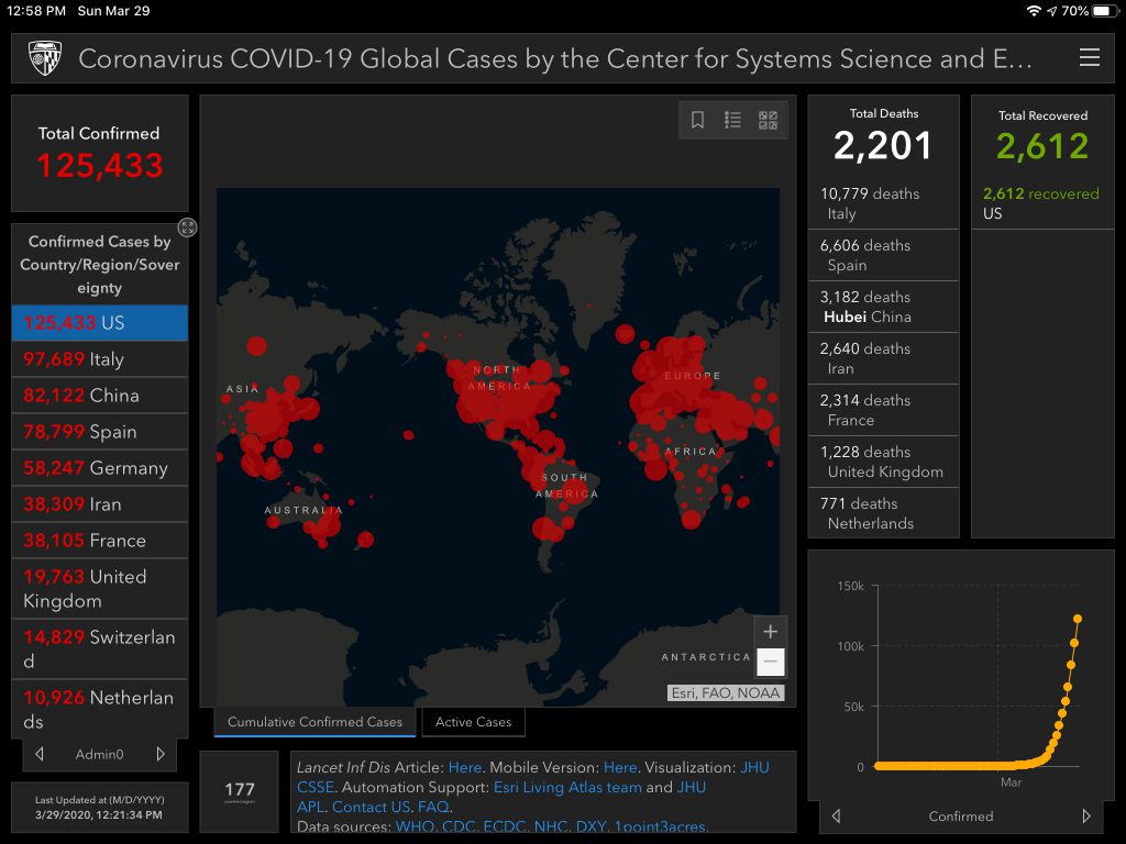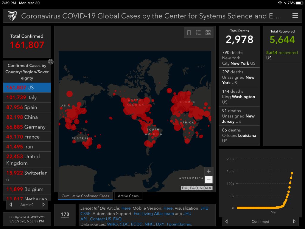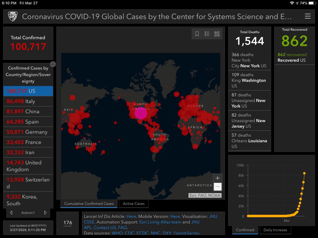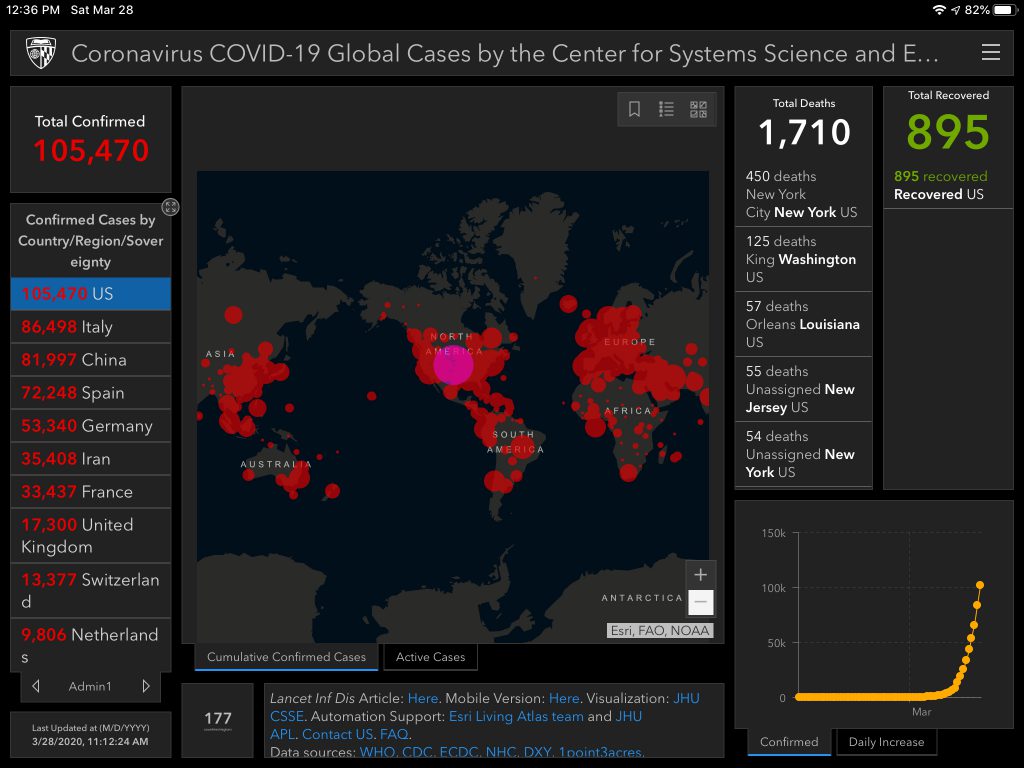 We’re about to pass 3,000 deaths in the US. 38,000 globally. Dr. Fauci and Dr. Birx sound pretty convinced that we’ll exceed 100,000 deaths in the US alone (even if we behave exactly as we’re supposed to). It’s really sad to accept that given that we’re just at 3% of that today.