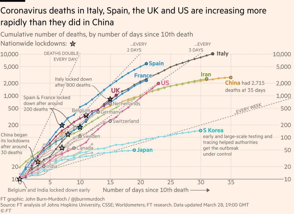 FT removed their paywall for their up-to-date Coronavirus tracker some time back which is worth including here as a reference. The chart below indicates that deaths in the US are doubling every 3 days: