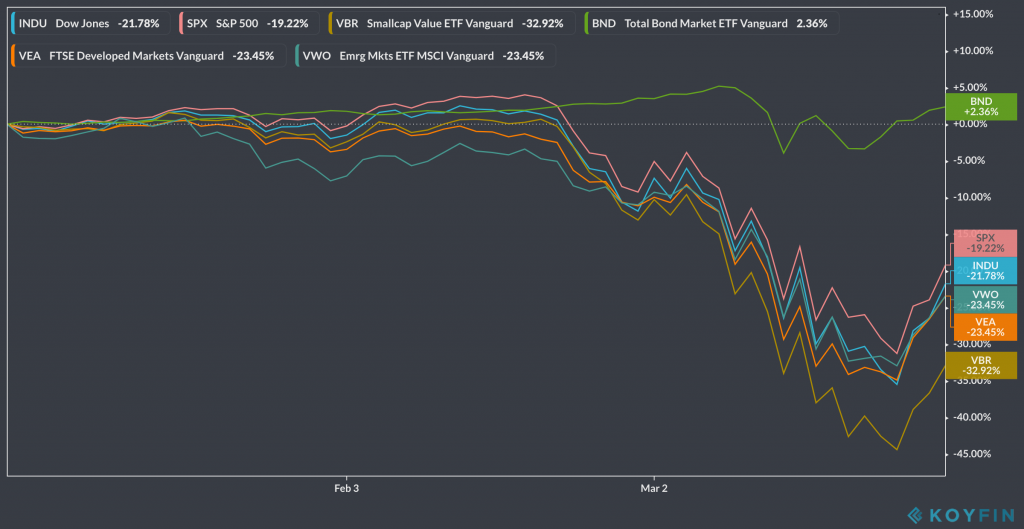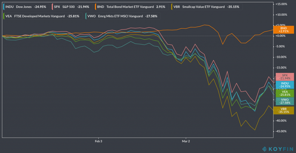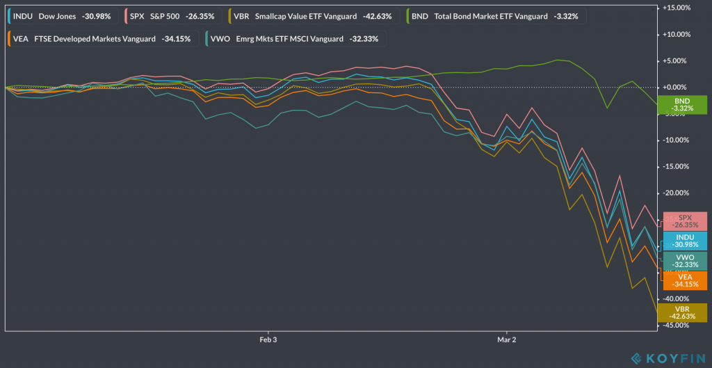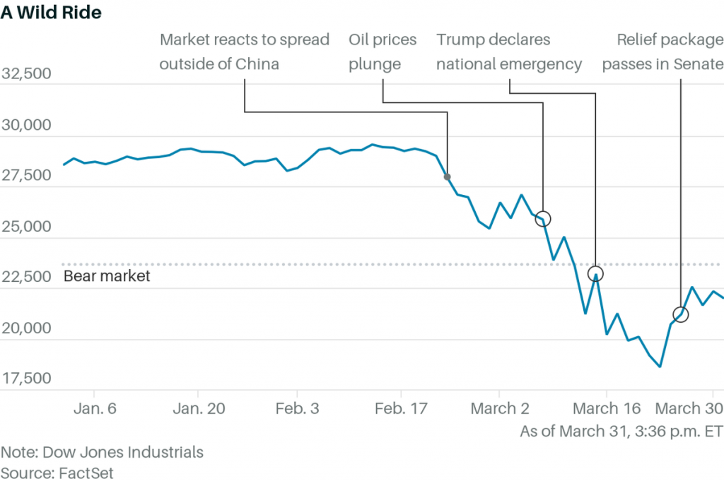 Tuesday. Last day of the month and Q1. Barron’s published The Dow Just Had Its Worst First Quarter in History. Here’s What History Says Could Happen Next. Dow down 23% for the quarter with the S&P 500 down 20%. I can’t help but think we’re nowhere close to the bottom.