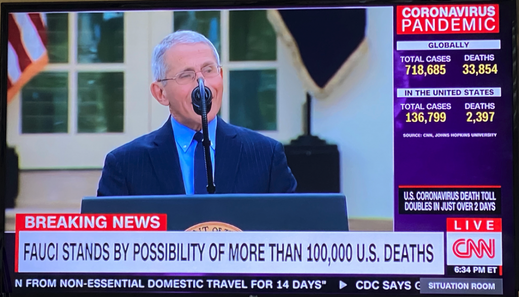 Young kids or corona babies who aren’t even born yet may stumble upon pages like this in 20 years to understand how these days feel. Some will have older family members tell them first-hand stories. Some stories will be terribly sad. What I’d say is that watching Dr. Fauci and Dr. Birx tell us to expect at least 100,000 deaths is like watching the radar of a raging hurricane brewing 2 miles off the coast, and the eye is likely to head right for us. And it’s too late to escape. Too late to prepare any further. It’s coming. It’s sad and scary. It feels surreal. Life, as many know it will be changed forever.