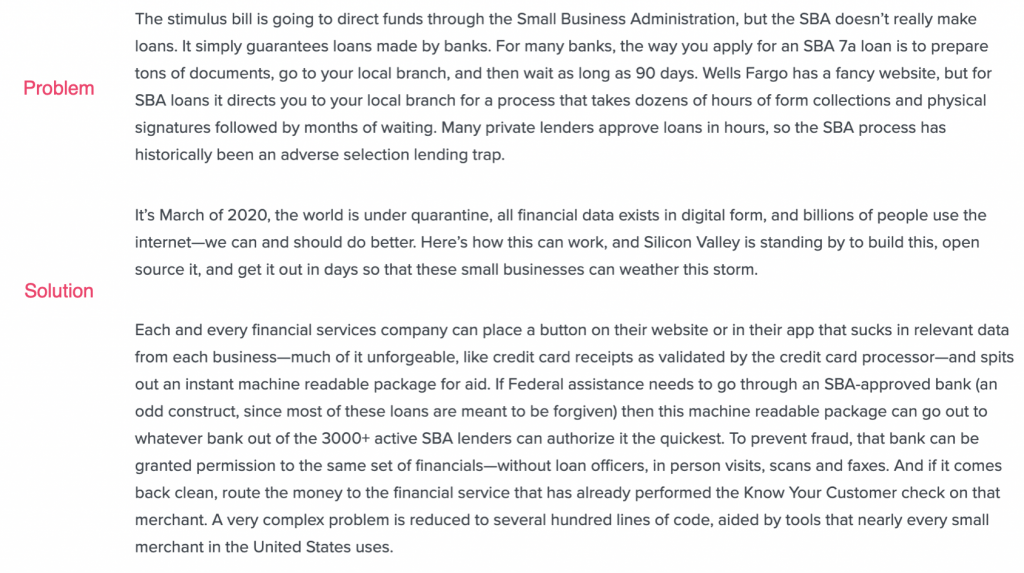 a16z partner Alex Rampell wrote a great post called Small Businesses Depend on the Stimulus Package. The Stimulus Will Depend on Fintech. He elegantly summarized the problem with operationalizing the distribution of >$300B in relief to SMBs. He proposed a solution to leverage modern fintech techniques & technology.