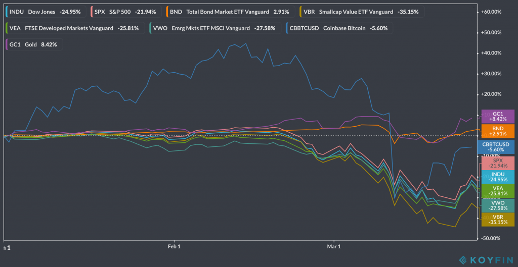 Not bad… $GLD up 8% and $BTC down just 5.6% ytd (despite a brief but steep ~50% fall from $7,900 on March 12). It’ll be interesting to see how all of these break away from the pack soon. Everything dumped initially. Everything. Nothing felt safe (but cash). But divergences are happening.