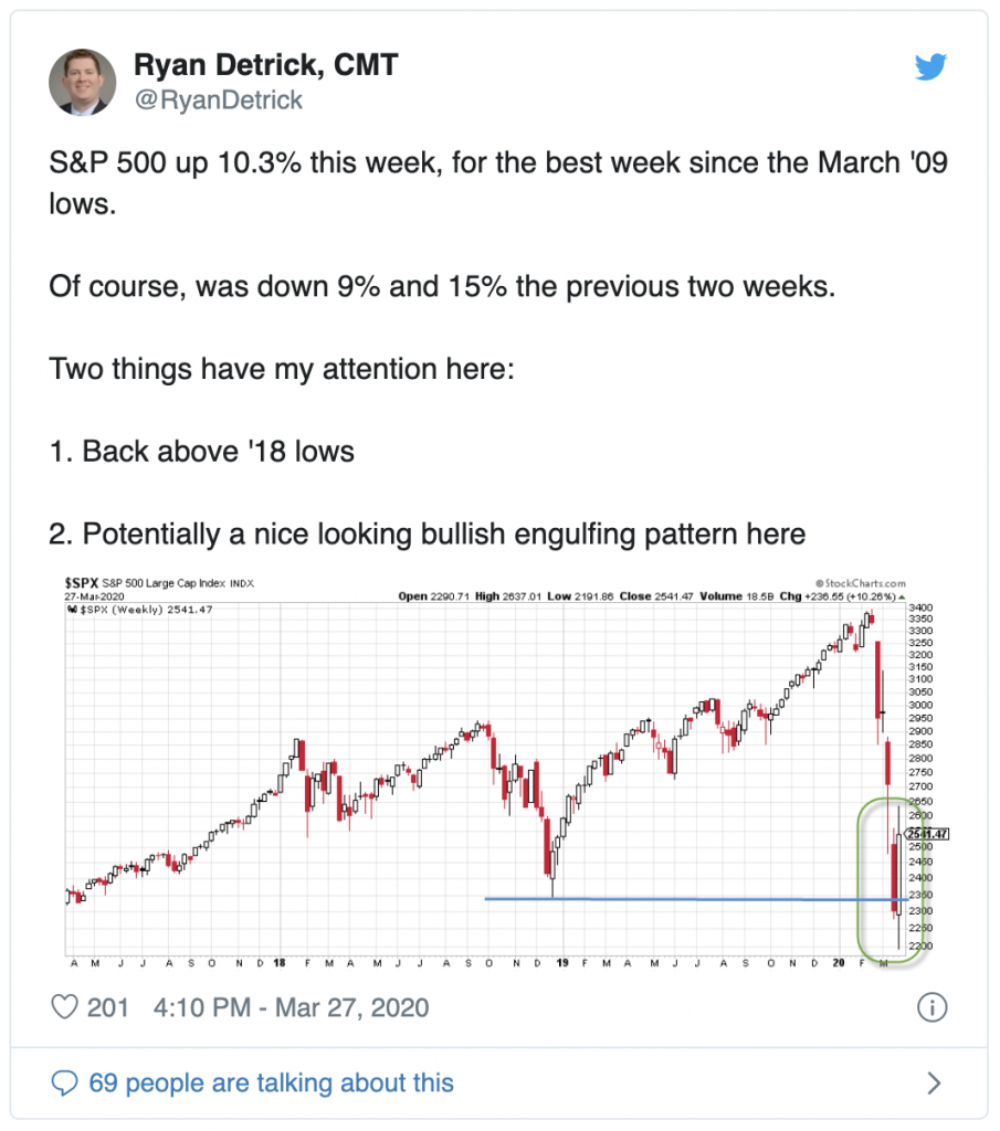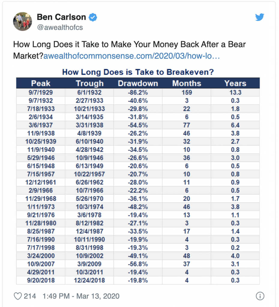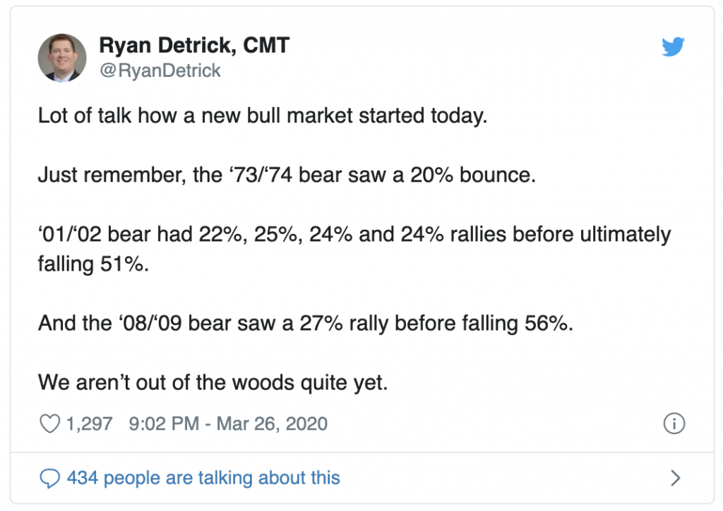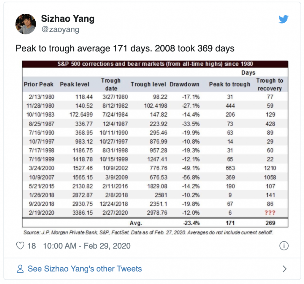 I don’t think we have, but I entered a couple of new positions that I’ve wanted to get into—very tiny amounts. I’ll only add to them if they drop 10%+ like $TGT at $92. There are deals out there, but it seems highly unlikely that maximum pain has been felt, that we’ve reached full capitulation, or that this virus and its impacts are going to get better from here. Thankfully the market experts like Ryan Detrick provide us with some relevant history: