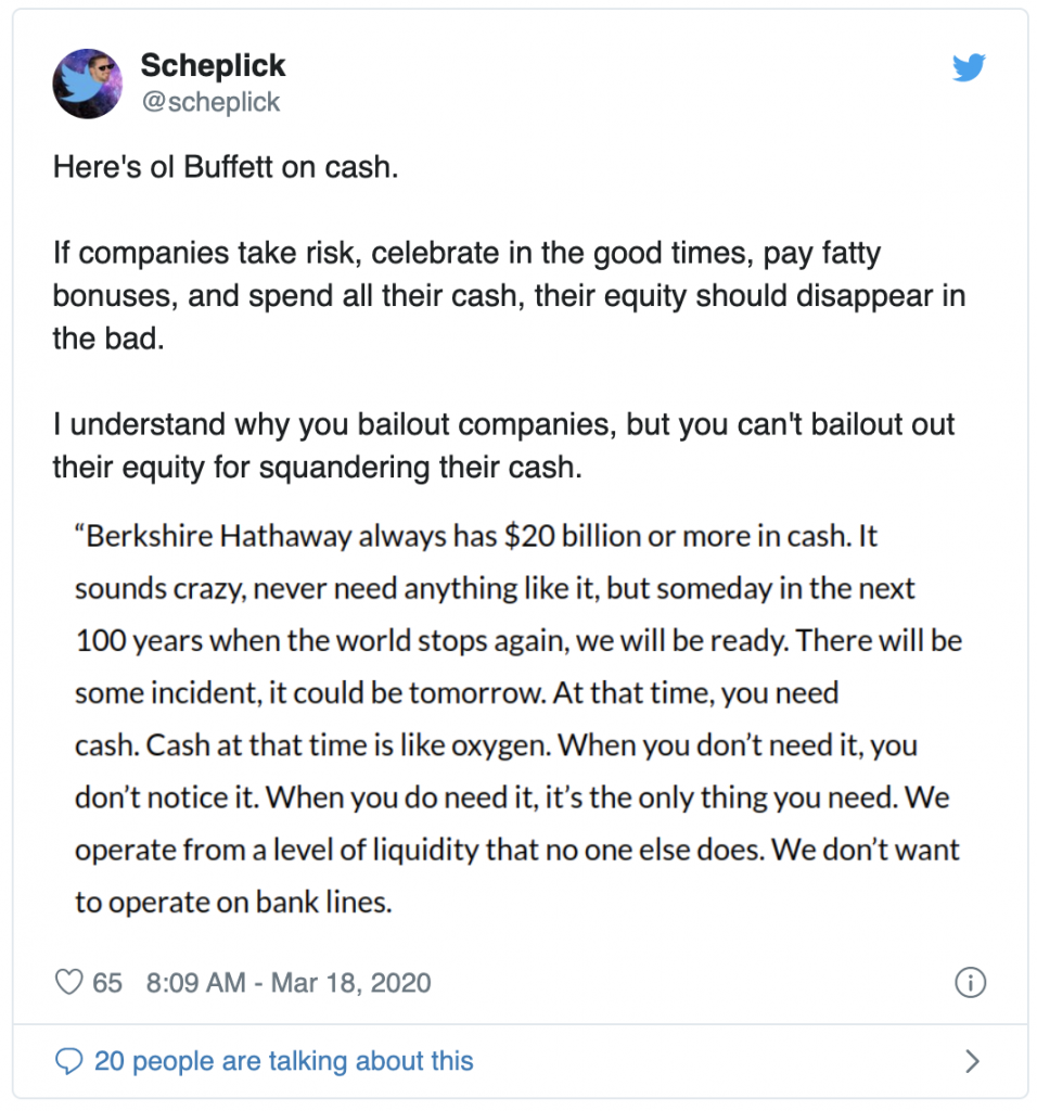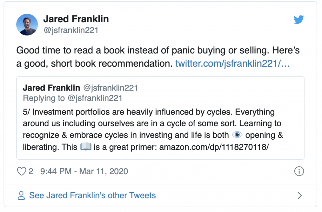 Howard Marks published a memo that will likely be a popular read for decades to come. I love everything he writes. He and Oaktree are going to provide investors like me with great material through the duration of this ‘event’ for lack of a better word. After all, his book on market cycles helped me position defensively in mid-2018. Read the memo.