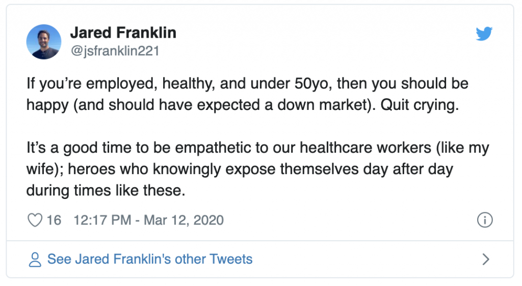 We’re observant. I remember the Dotcom crash, 9/11, the 08-09 GFC. We’re savers. We learned from those crises despite not being market participants due to our age. I dedicated most of my reading capacity in my 20s to the greats (The Intelligent Investor, A Random Walk Down Wall Street, Stop Acting Rich, Bogleheads, etc.). I think personal finance is one of the most important topics for people to master. Don't leave it up to so-called experts. I started positioning our portfolios more conservatively in mid-2018. It was becoming clear that we’re later in a cycle than earlier, so I wanted it to be more defensive than offensive. We’re pretty much as prepared as it gets, and yet it's still scary for us. Everyone has a unique relationship with work, finances, and their health. And I have extreme empathy for those less fortunate or less prepared than us.