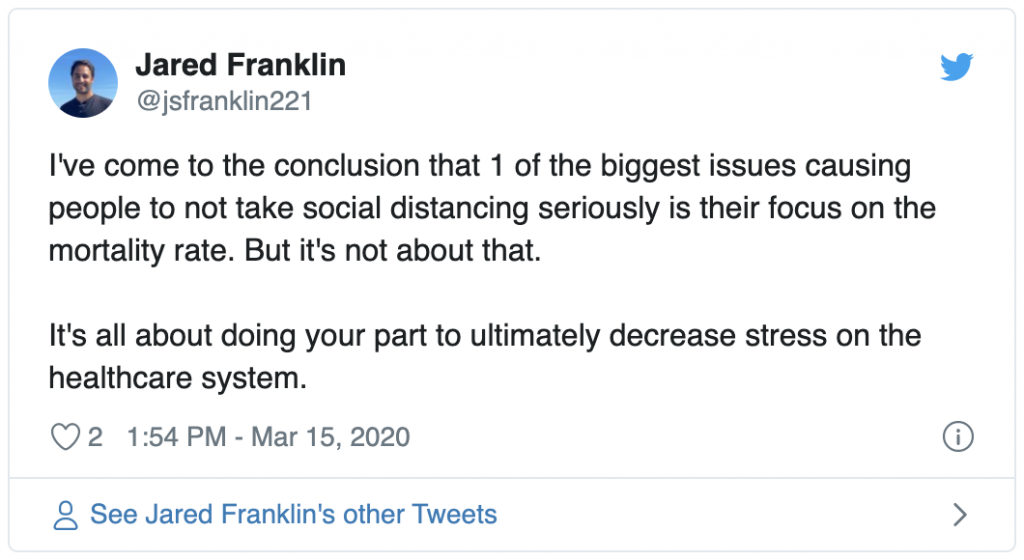 I started to worry more about my wife. She’s finally feeling shook. And I hear stories from friends of hers in the healthcare space. They’re all scared. They lack protective equipment, and many infected are asymptomatic. So they start to think that they’ve been exposed with every human interaction. That becomes stressful. And to most people’s surprise, most aren’t compensated for the value they provide, ESPECIALLY during times like these. Sometimes people need to be reminded how good they have it (myself included).