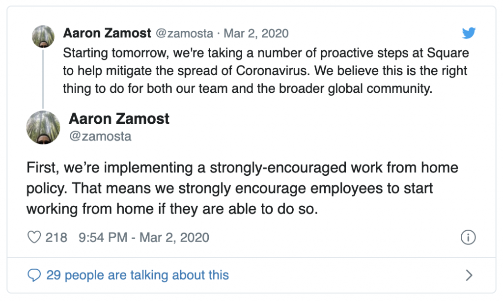 A shift to working from home kicked off for information workers across the country, starting with companies like Square & Twitter.