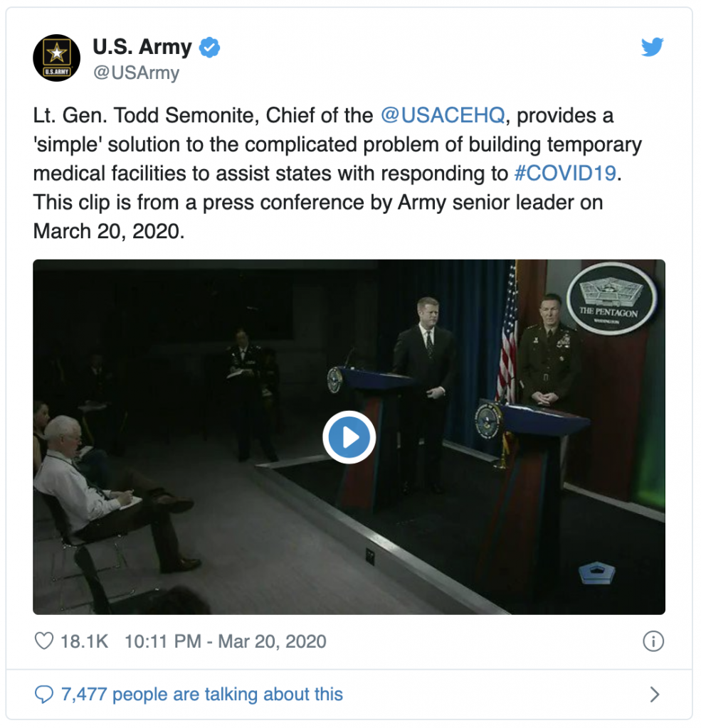 Lt. General Todd Semonite has also become a popular man. His decisiveness and ability to articulate a sound plan regarding increasing hospital capacity is what everyone wants to hear and see.