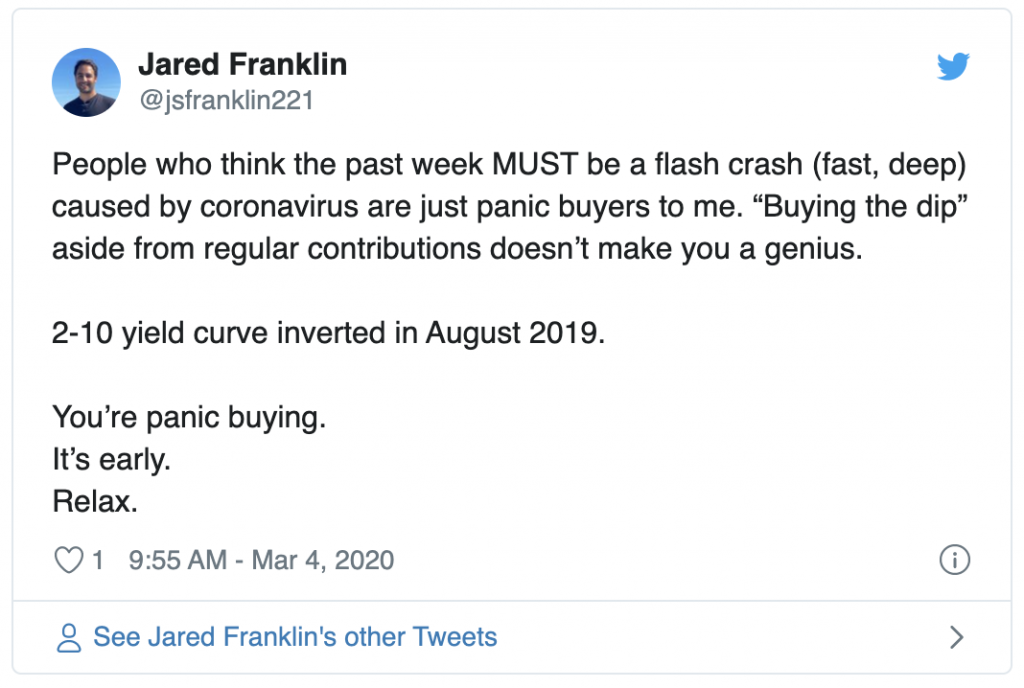 During times of uncertainty, I look to Twitter not only to try to help others but as a tool to help reinforce my own beliefs to myself. If I write it, I’ll be more inclined to go with it. We just had a significant drop, but I don’t think we’re done, and I don’t think we’re reversing either.