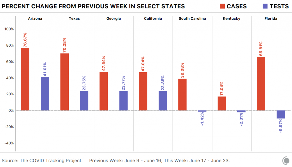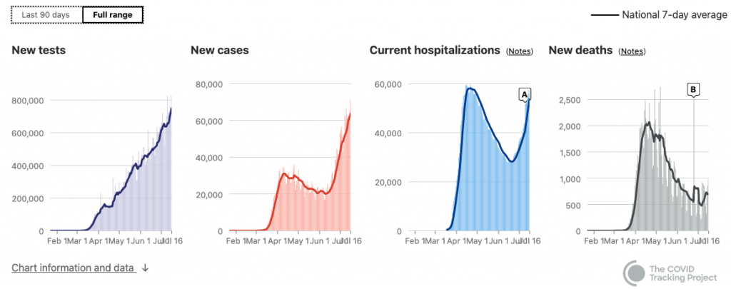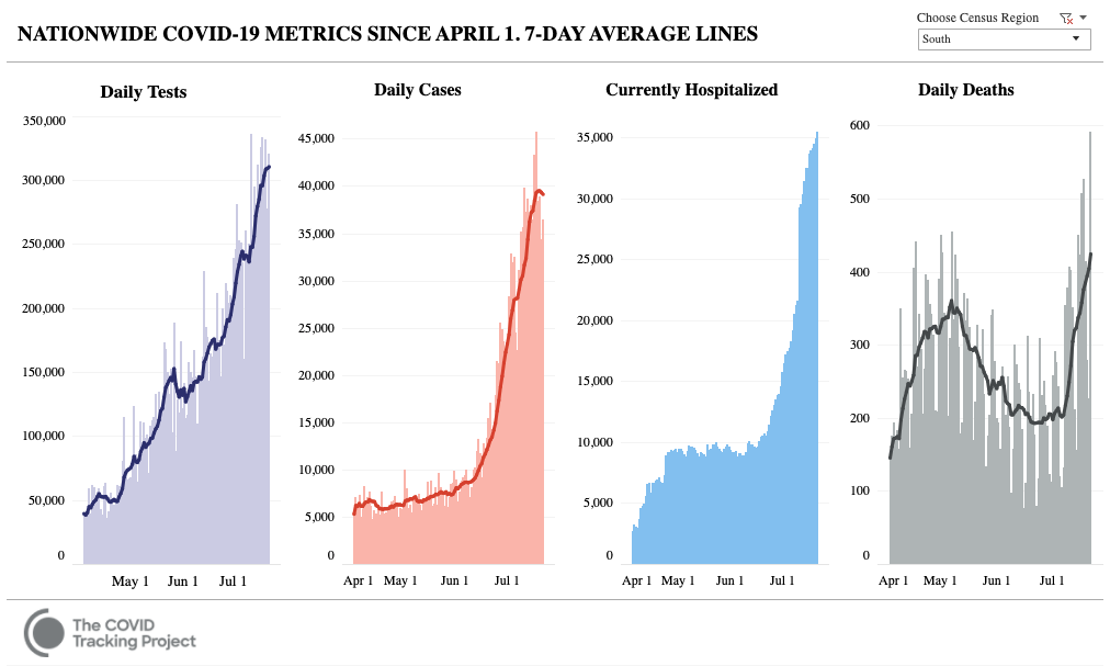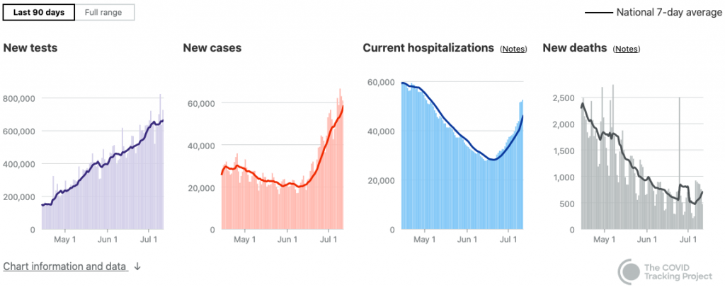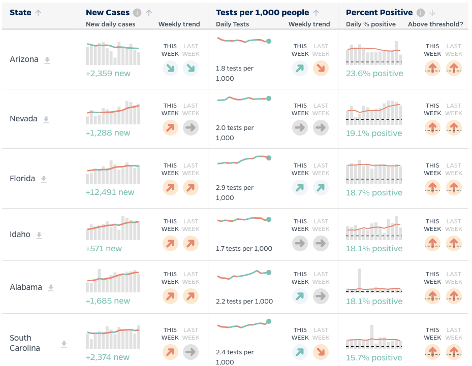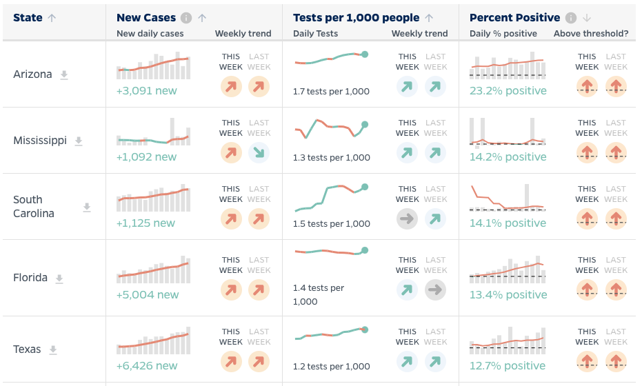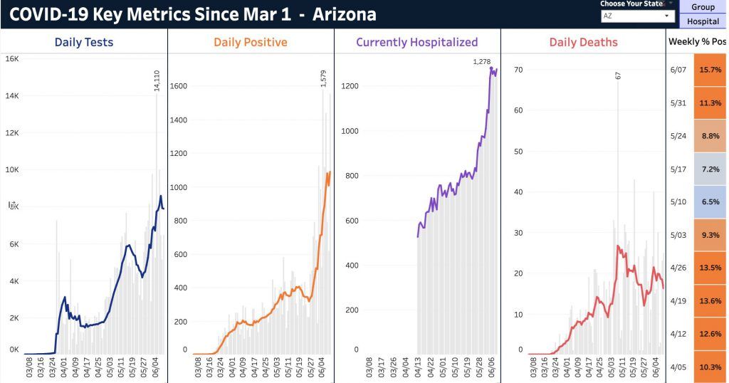 According to covidtracking.com, Arizona, and South Carolina are on an unfortunate trajectory. Many states are seeing rising trends in positive cases, but they’re proportionate with their increase in tests. The image below of Arizona is concerning because of the hospitalizations, and then likely rise soon in deaths.