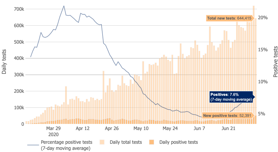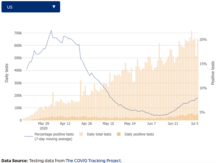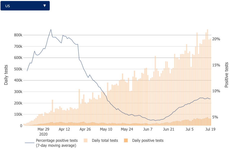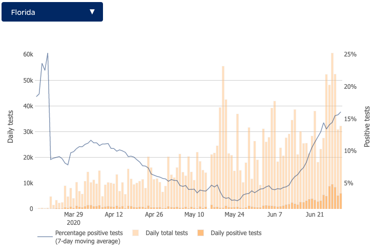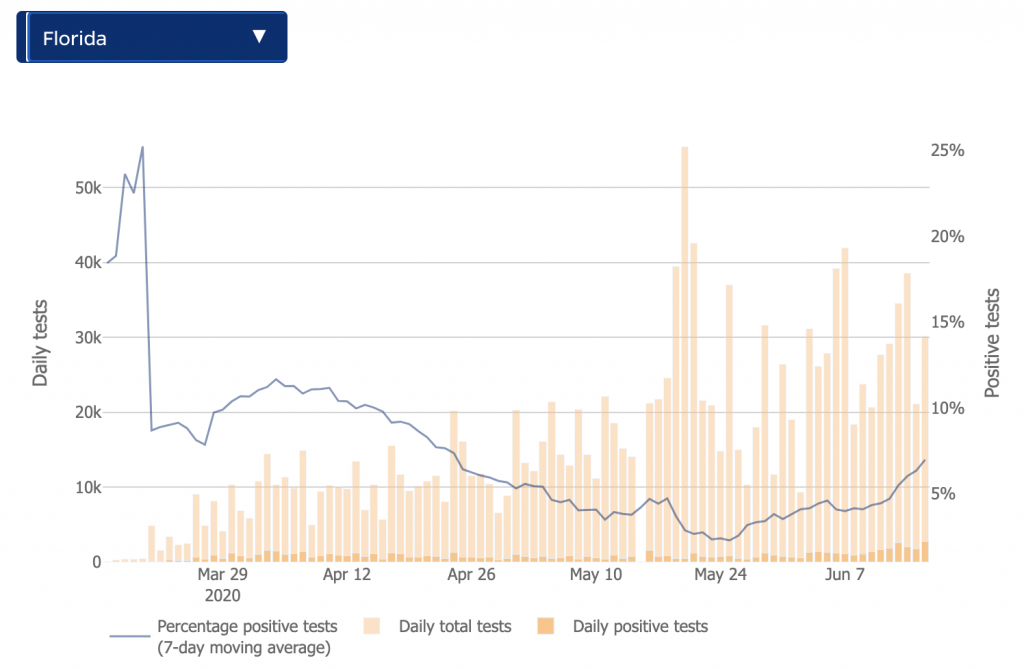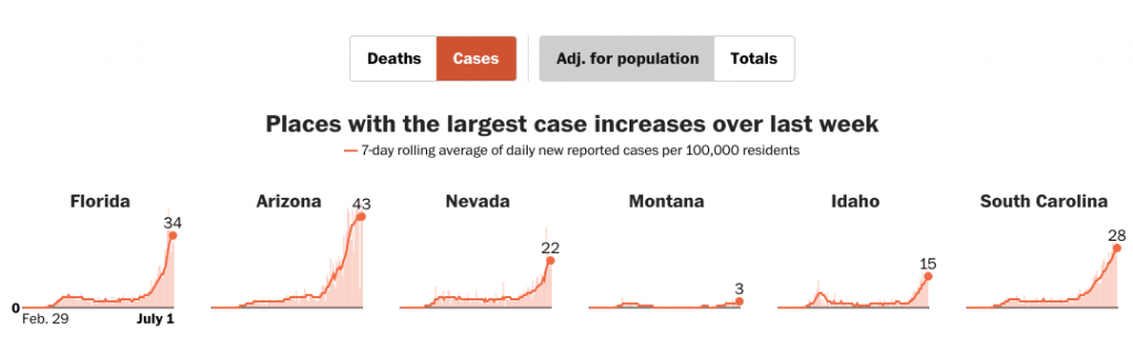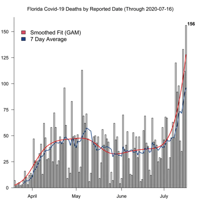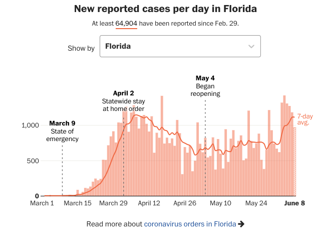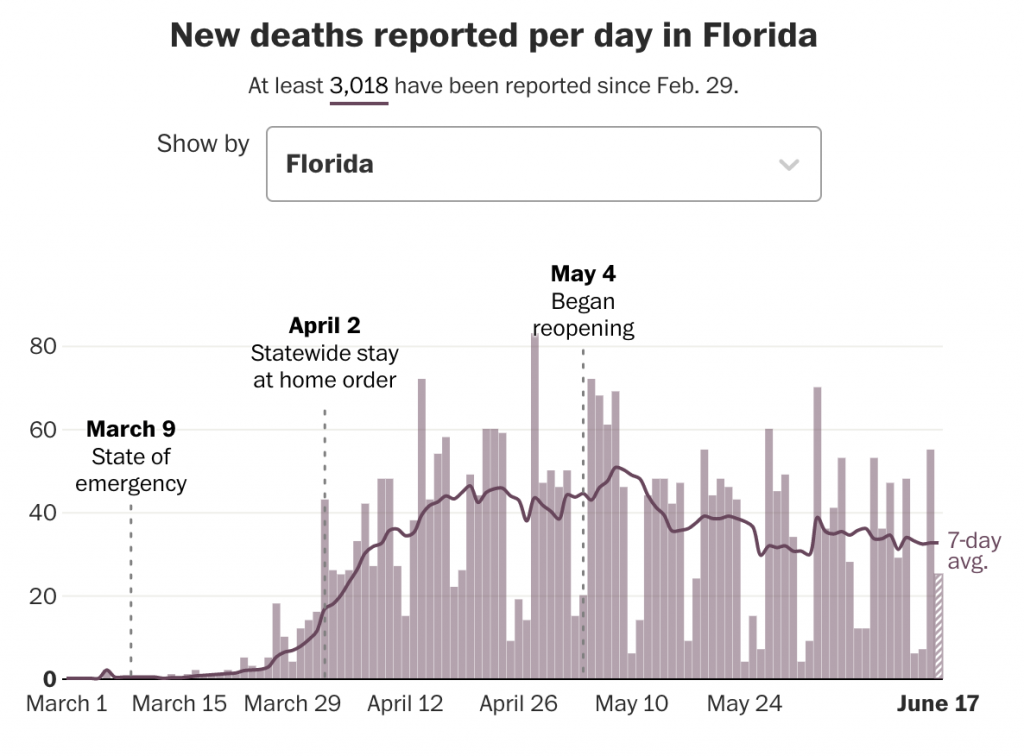 The Washington Post Coronavirus page is quite helpful. It has interactive charts to visualize data like the 7-day average for US deaths (which has been trending down). But the same can’t be said for new cases, and we know cases precede deaths. See the image of Florida below, showing a rising 7-day average. Fortunately, their Total Tests Reported chart highlights that FL has been increasing testing, which likely largely explains the increase in positive cases. But we still have to wonder if the 7-day average of FL deaths will remain flat or increase over the next two weeks? If it grows, at what rate? There’s still so much uncertainty.