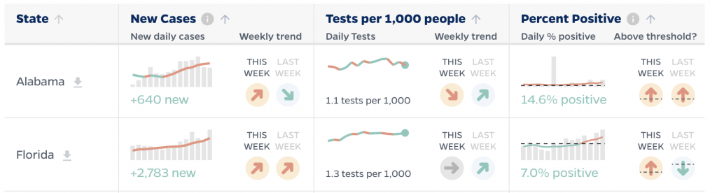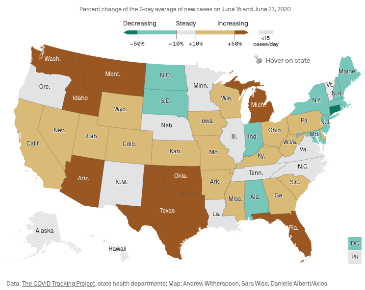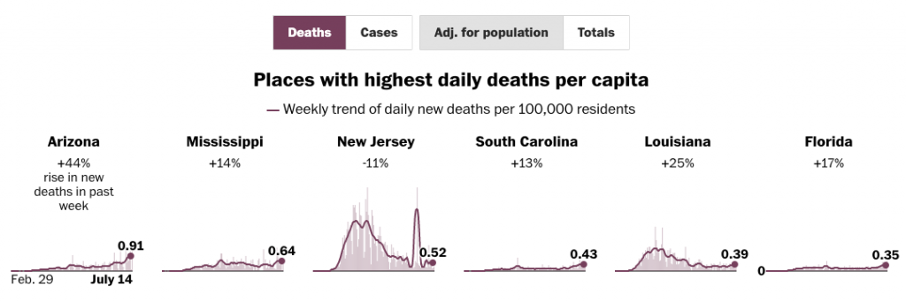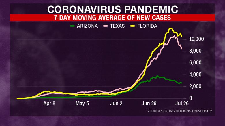 Time for some seemingly rare good news! “The 7-day average of new confirmed coronavirus cases has flattened or slightly decreased in Texas, Arizona and Florida recently.” Let’s hope it sticks.