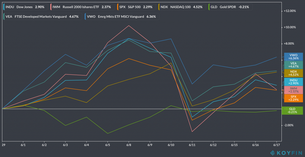 Friday. 4 of 5 trading days were green this week. Stocks ripped. Russell 2k closed up 3.9% today. Energy was the leading sector, closing up 7.4%. $IWM finished the week up over 8%, $INDU up 6.5%, and $SPX up 4.65%. Don’t forget— civil unrest, a pandemic, and murky China relations. So…. wtf?