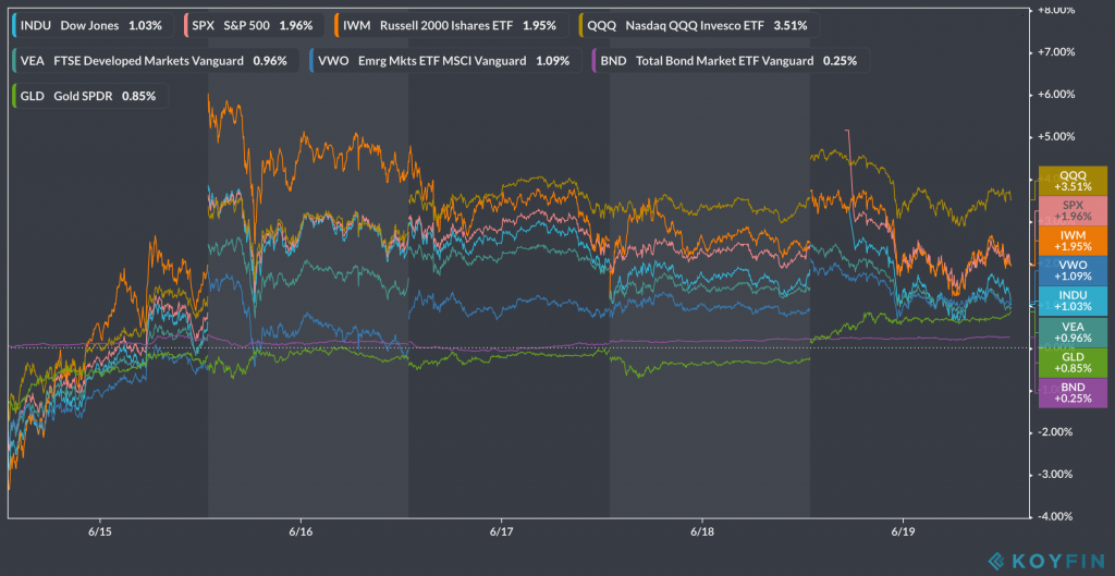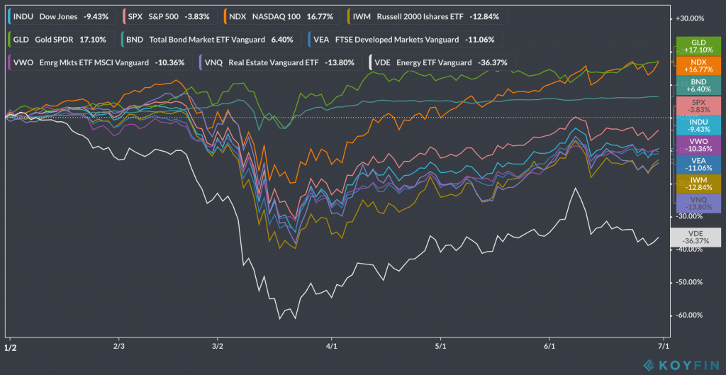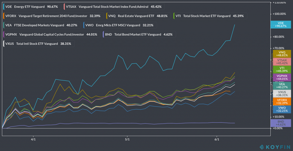 Tuesday. Feels like Friday already. June already feels like its been 60 days long. Major indexes closed green, led by the Dow Jones up 1.1%. Energy was the leading sector, closing up 2.8%.