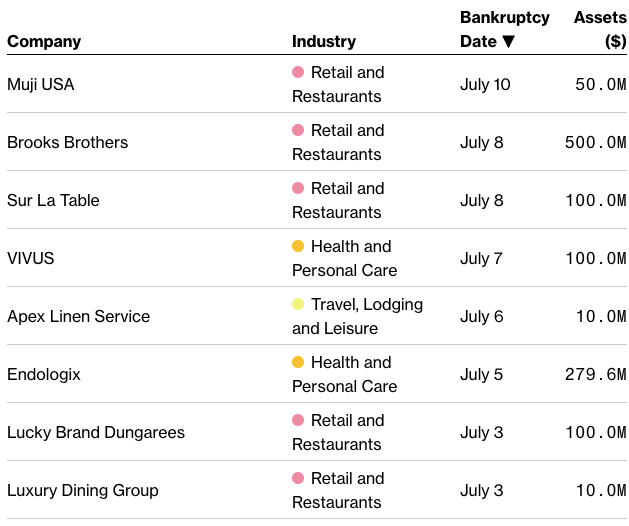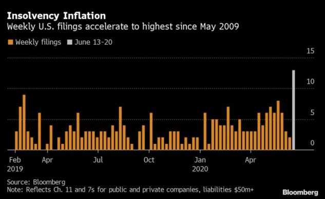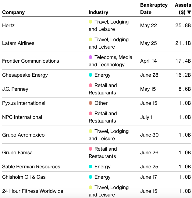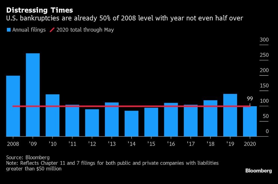 According to Bloomberg, bankruptcies (with liabilities > $50M) are already at 50% of 2008 levels, and it’s only the beginning of June: