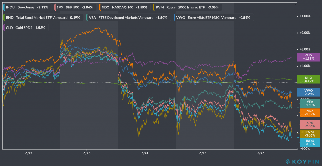 Thursday. Major indexes closed red for the first day this week. The S&P 500 closed down .6%. Gold is up about 1%.