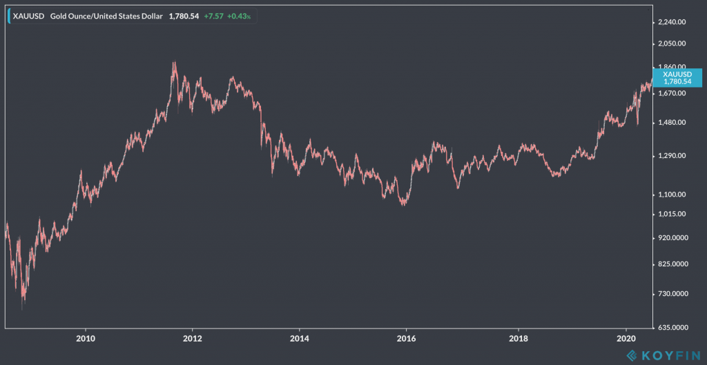Gold’s officially dominating investing headlines. Bloomberg published Goldman Warns Dollar’s Role as World Reserve Currency Is at Risk. Daniel Sharp of Goldman said, “Real concerns around the longevity of the U.S. dollar as a reserve currency have started to emerge. Gold is the currency of last resort, particularly in an environment like the current one where governments are debasing their fiat currencies and pushing real interest rates to all-time lows. The resulting expanded balance sheets and vast money creation spurs debasement fears.”