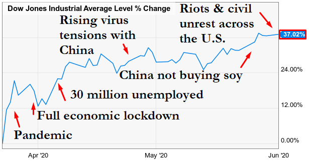 I chuckled at this chart from Quoth the Raven showing how the Dow increased 37% since March: