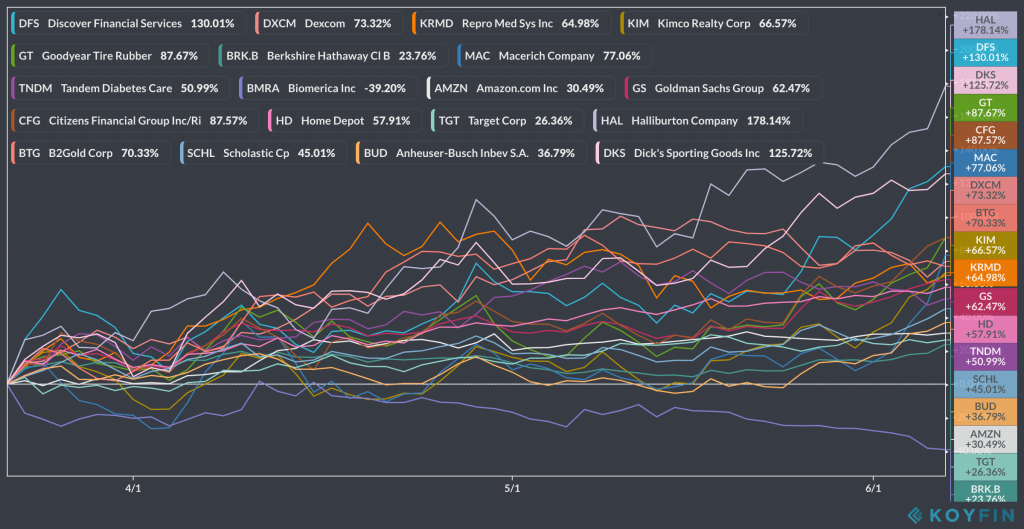 Sunday. I thought I’d look back at the performance since the March bottom of stocks & funds that I own or watch-to-own. Such a face-ripping bounce.