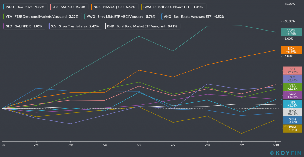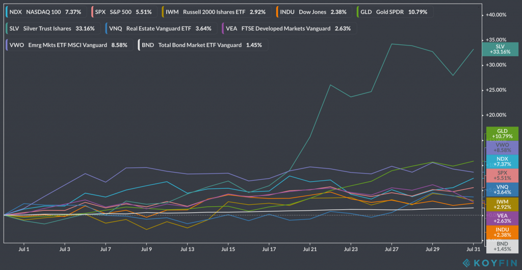 Friday. The Russell 2k dropped -.98%, but the rest of the indexes were green. The Nasdaq closed +1.5%, S&P 500 +.77%, and Dow +.44%. Gold rose another +1.6%, and Silver continued it’s ascent, gaining +5.4%. Here’s a glance at MTD performance:
