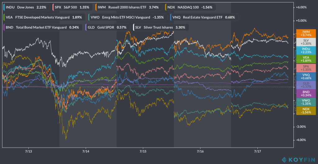 Monday. The Nasdaq led, closing up 2.5%, followed by the S&P 500 +.84%, which was a 5-month high for the index. The Dow was flat, and Russell 2k closed -.25%. Gold and Silver were both green. Silver marched to a 4-year high, exceeding $20/oz for the first time since 2016.