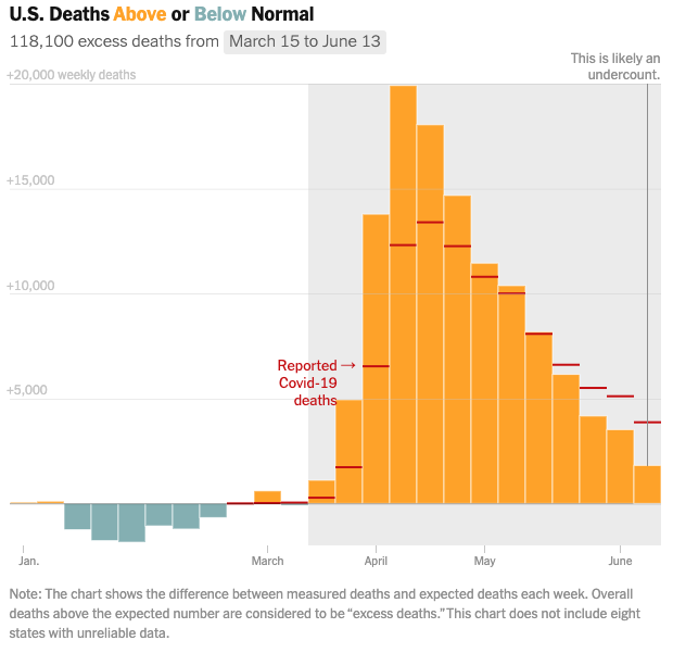The New York Times published What Is the Real Coronavirus Death Toll in Each State? COVID reporting has a lot of problems. Hopefully, it continues to improve over time. But total deaths (from all causes) are what they are– you can’t dispute or debate the count. “Nationwide, at least 118,100 more people have died than usual between March 15 and June 13. That number is more than 21,600 higher than the official count of coronavirus deaths for that period. Higher-than-normal death rates are now widespread across the country; of the states with reliable data, only five show numbers that look similar to recent years… Through June 13, excess deaths in the parts of the United States with sufficient data were about 22 percent higher than the official coronavirus fatality count. If this pattern holds for the rest of the country, it would put the current death toll at more than 161,000 people… Measuring excess deaths is crude, but many epidemiologists believe it is the best way to measure the impact of the virus in real time. It shows how the virus is altering normal patterns of mortality and undermines arguments that it is merely killing vulnerable people who would have died anyway.”