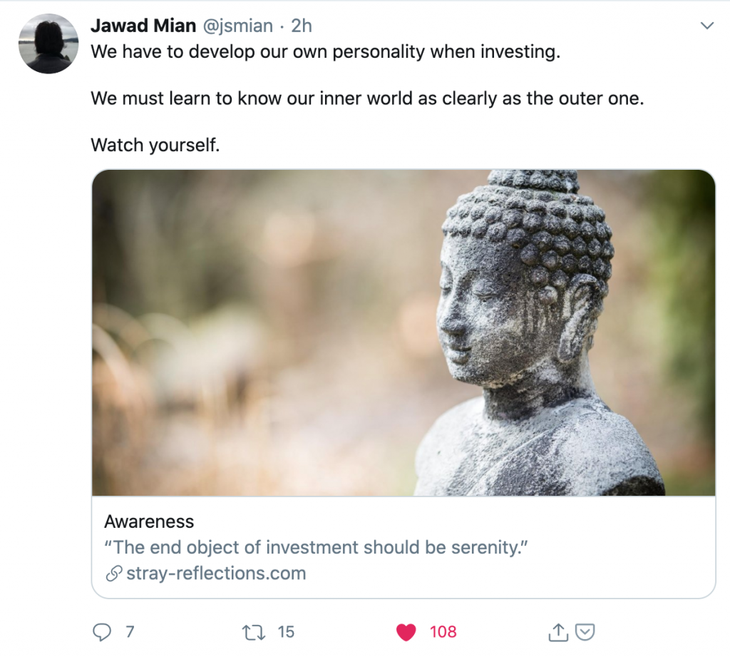 Maybe that’s what this series is all about– maintaining awareness of the macro, micro, and self– and learning what type of investor I am. I’ve shifted my strategy through the crisis, and I’ve struggled a bit with understanding if I’m doing what a great investor should do or if becoming more active (something I’ve shunned for the past decade) will prove to be a mistake. Either way, as Jawad says, we have to develop our own personality. Development implies evolution.