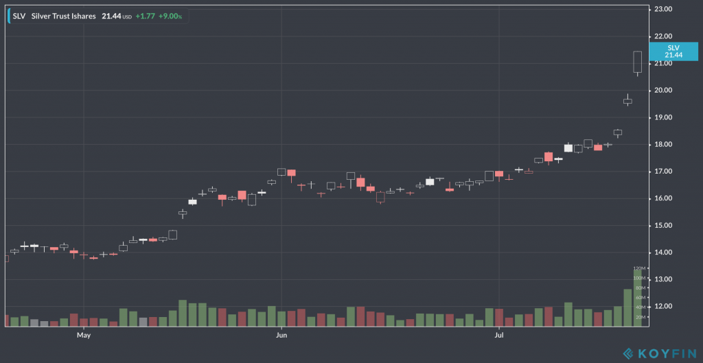Monday. Green all around (well, and gold, and silver, and…). The Nasdaq closed +1.6%, Russell 2k +1%, S&P 500 +.74%, and Dow +.44%. In metal land, $GLD is +1.9%, $SLV is +7.6%, and $GDX closed +4.8%. $BTC used it’s weekend momentum to fly through the $10k’s to ~$10,840, launching $GBTC +17% to $12.15. It’s certainly a fun time to watch the markets.