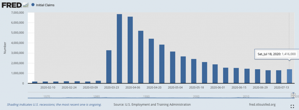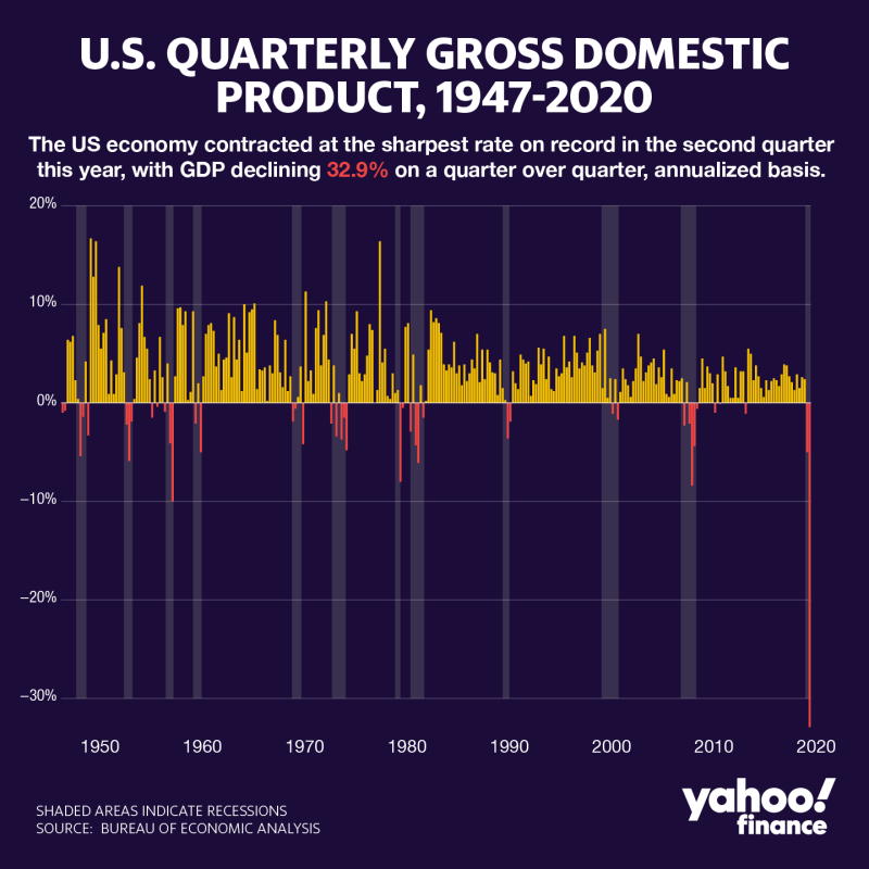 In addition to a worsening jobless number, Q2 GDP dropped -32.9% QoQ annualized. “At 32.9%, the second-quarter annualized contraction marked by far the worst plunge ever recorded, based on Bureau of Economic Analysis data spanning back to 1947. Before the pandemic, the worst GDP print on record was in the first quarter of 1958, when GDP fell 10.0% on an annualized basis.”