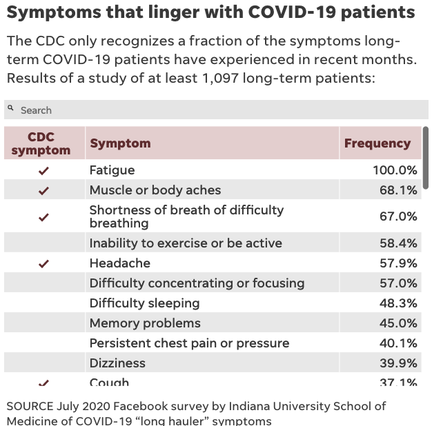 Long-lasting COVID symptoms from lungs to limbs linger in coronavirus ‘long haulers’ was published yesterday by USA Today. Dr. Maja Artandi, medical director of an outpatient COVID-19 clinic at Stanford University hospital, said, “We definitely see prolonged symptoms, sometimes a lingering cough and the most serious cases have long term chest pains and still feel they can’t breathe well. It just causes all kinds of inflammation and takes a while to heal.”