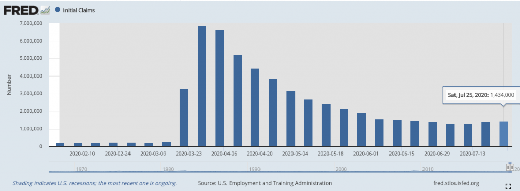 Jobless claims rose another 1.434M. The total since mid-late March is ~54M. For context, the entire GFC of 08-09 saw just over 37M.