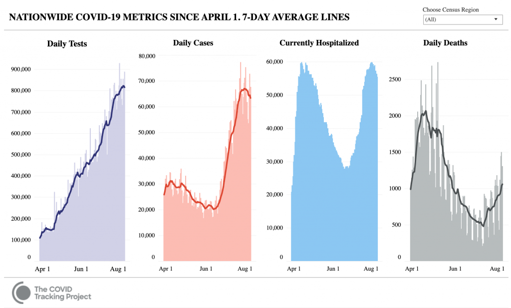 - Will positive cases, hospitalizations, and deaths start to increase over the next two weeks following a month of ‘reopening efforts’ + large public gatherings?