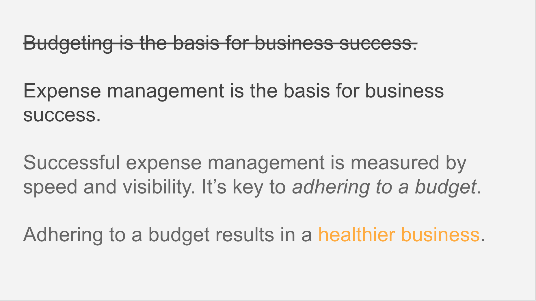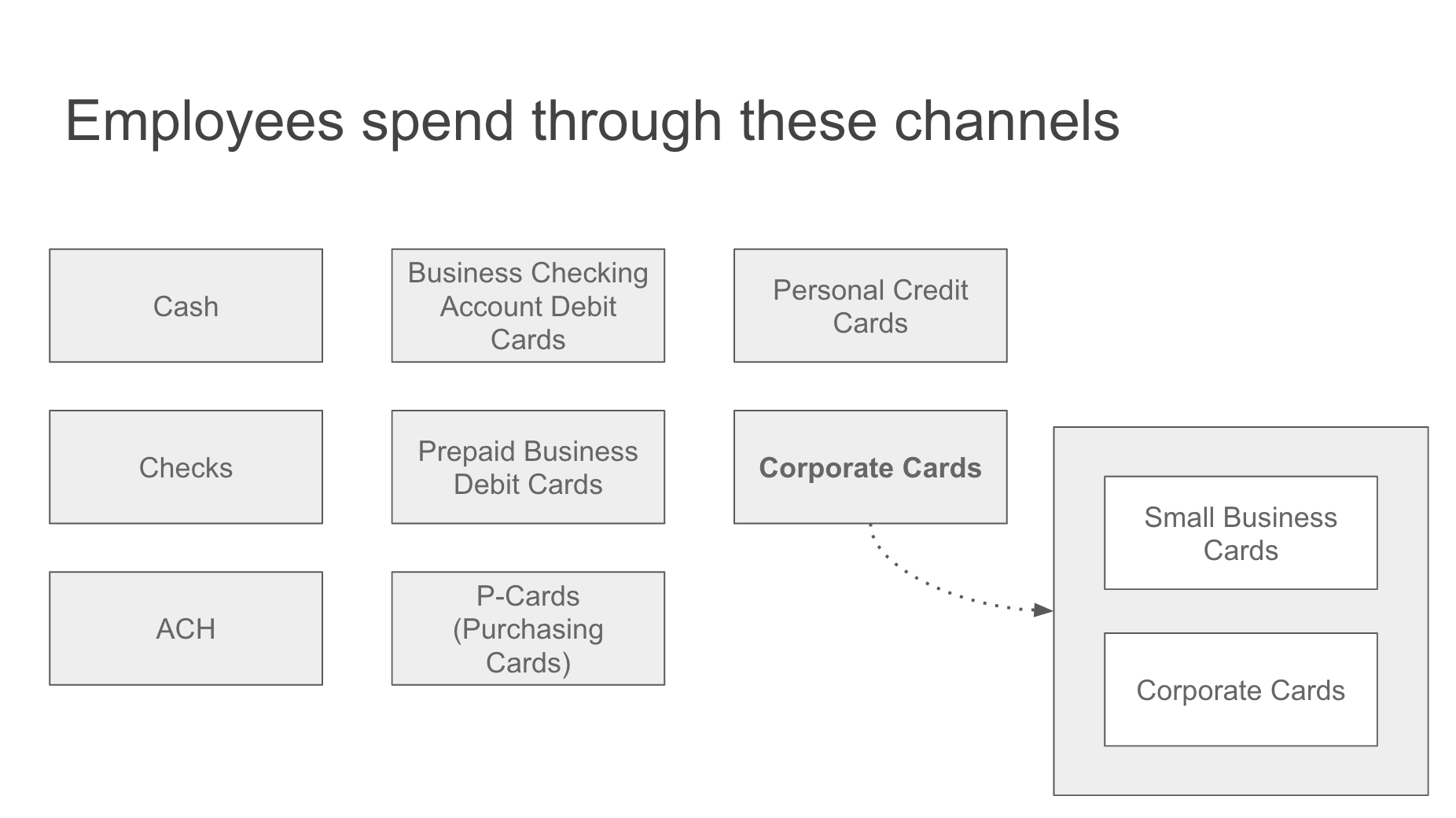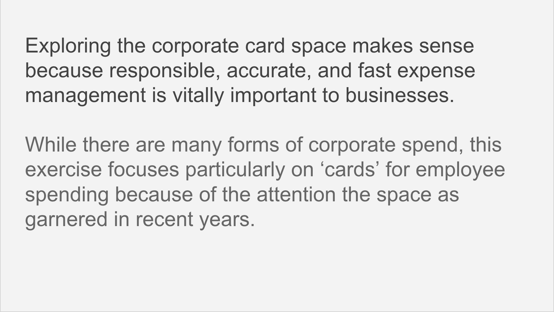 Every presentation needs to start the audience off on a level playing field. They need to be brought up to speed. They need to know what you’re talking about and more importantly, why it matters. After all, why do corporate cards matter? What function do they serve? How do they relate to other forms of corporate spending?