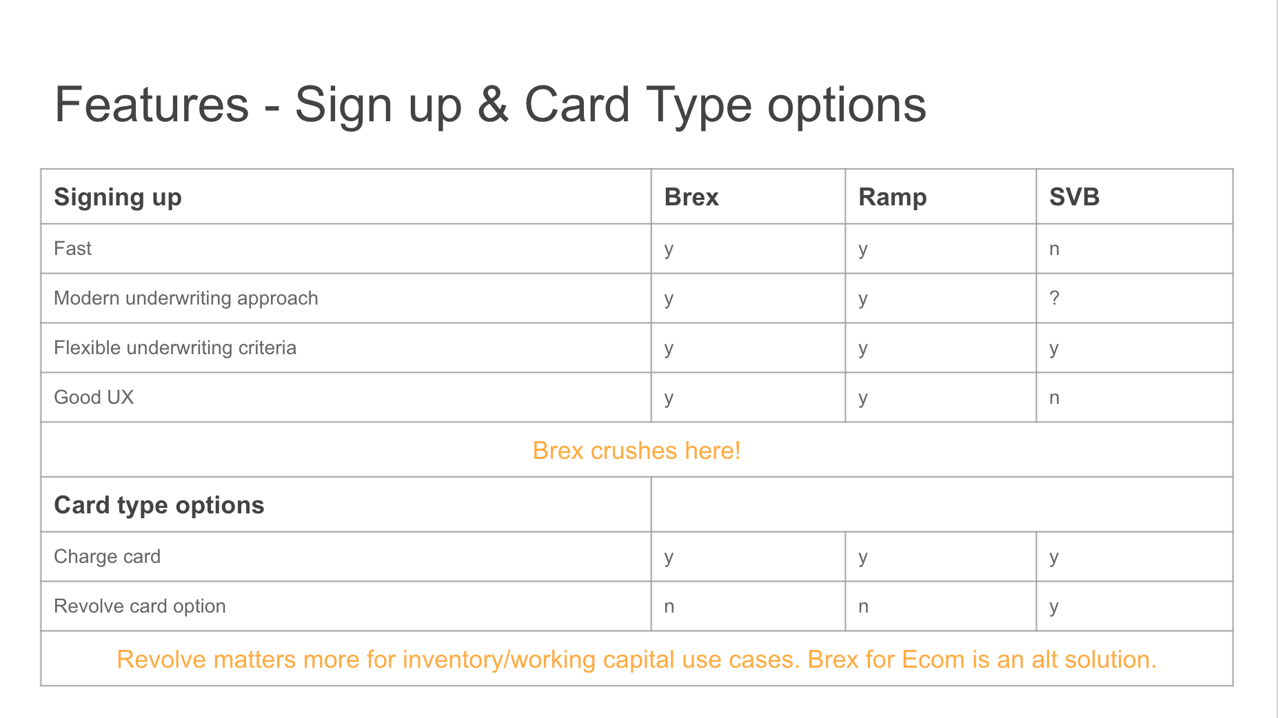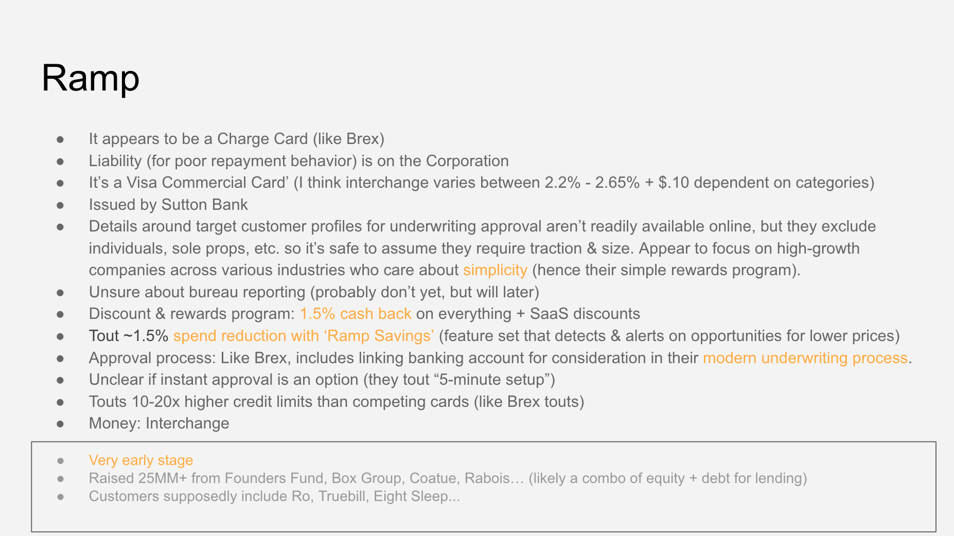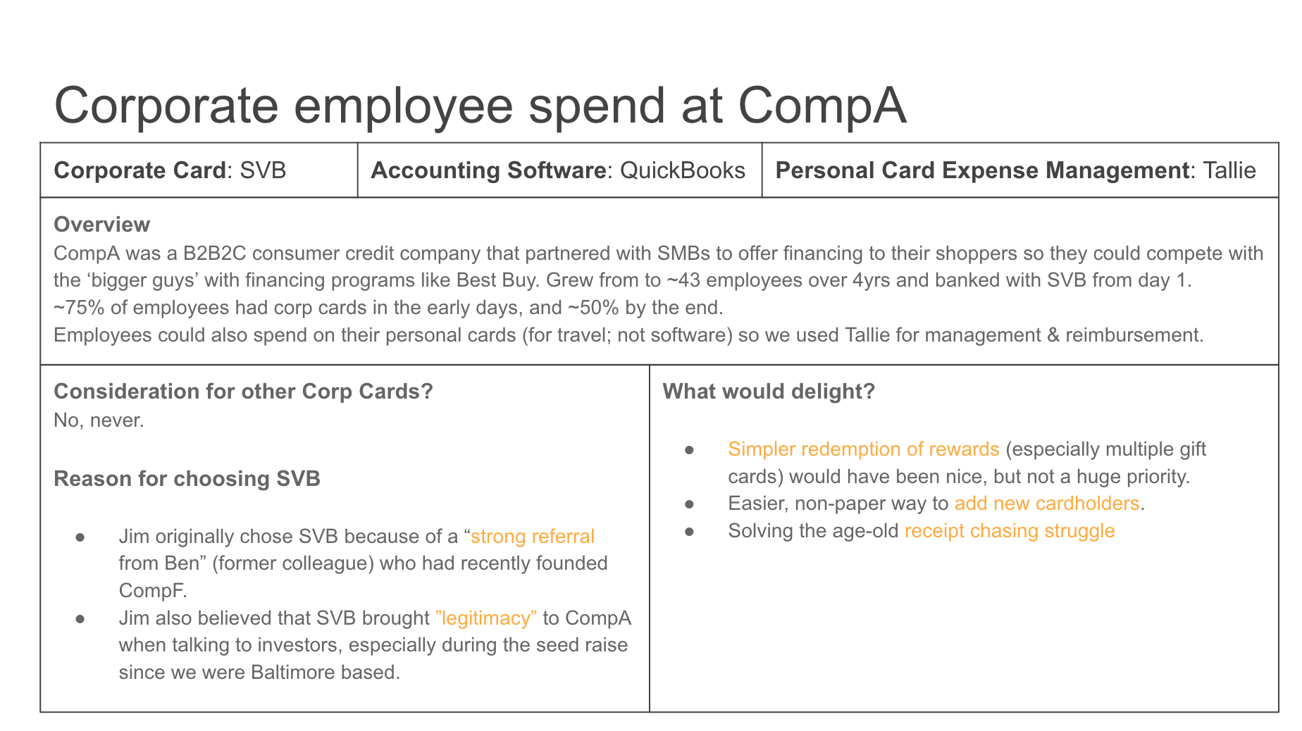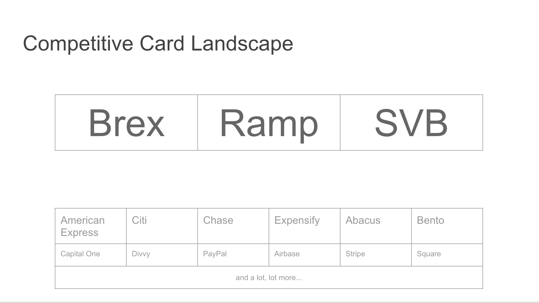 These are the types of questions that need exploring to gain an understanding of the space. Most of my experience is in consumer credit (both Blispay and Bill Me Later/PayPal Credit were B2B2C businesses). I have no experience in the business lending space, so going through the thought exercise to tie corporate cards to expense management in the Background section was critical in helping me understand the big picture. Digging into the competitive landscape is an extension of that.