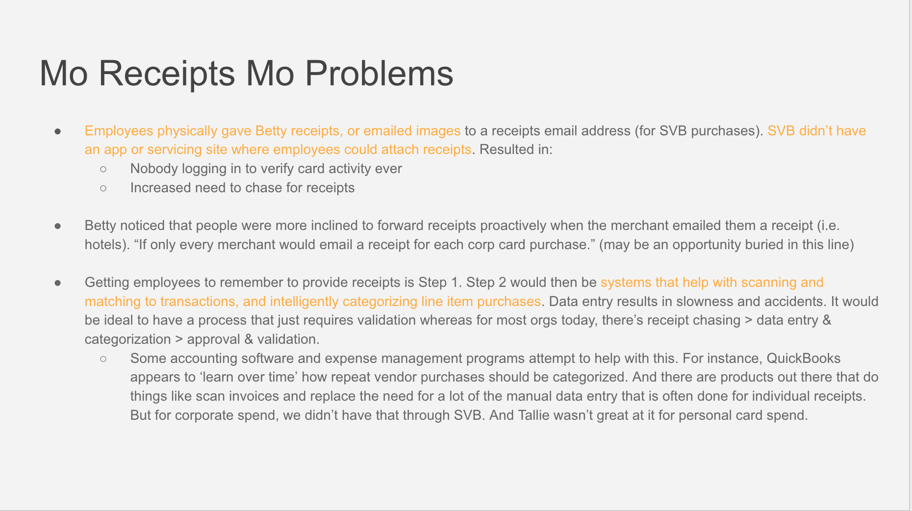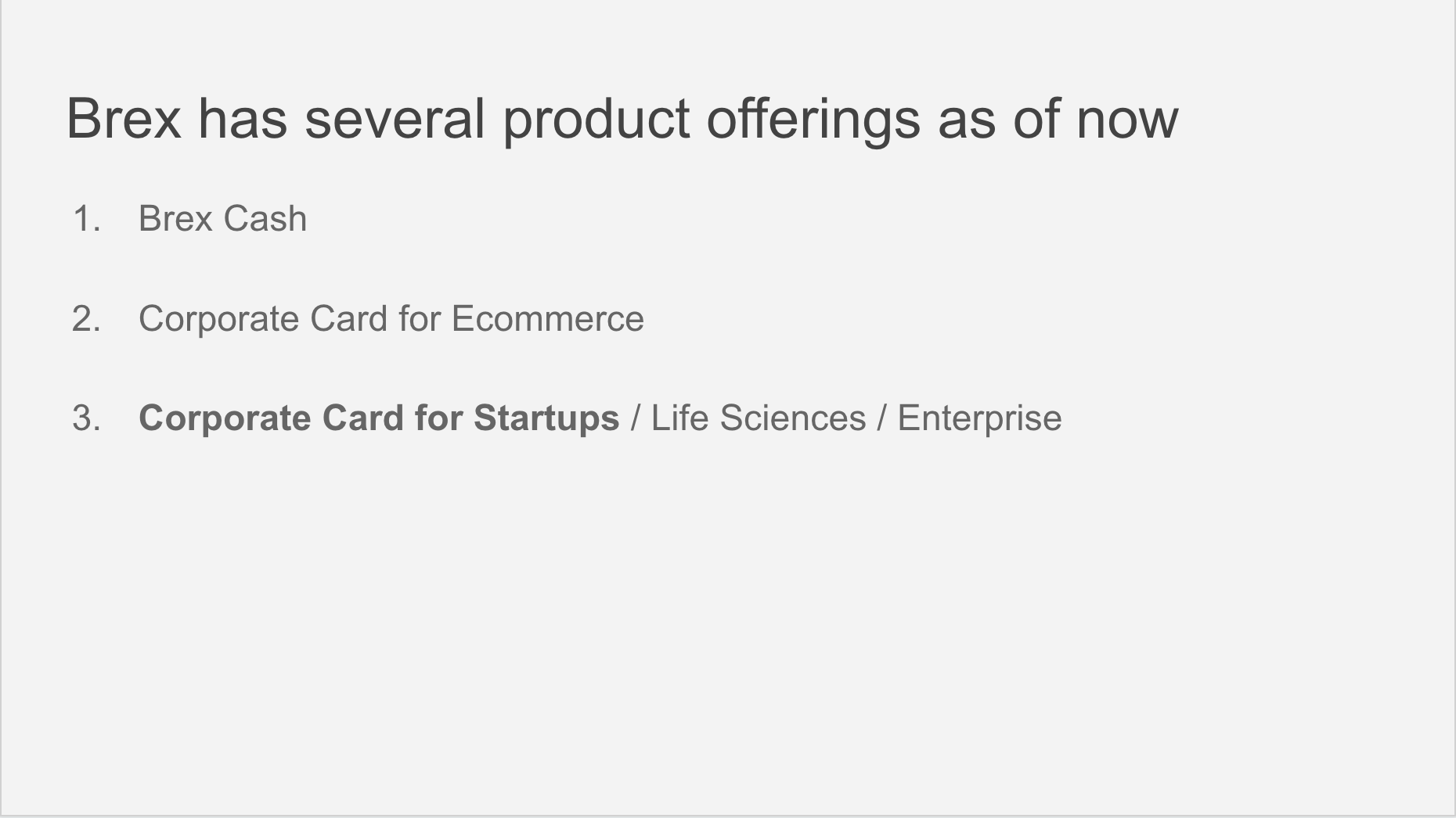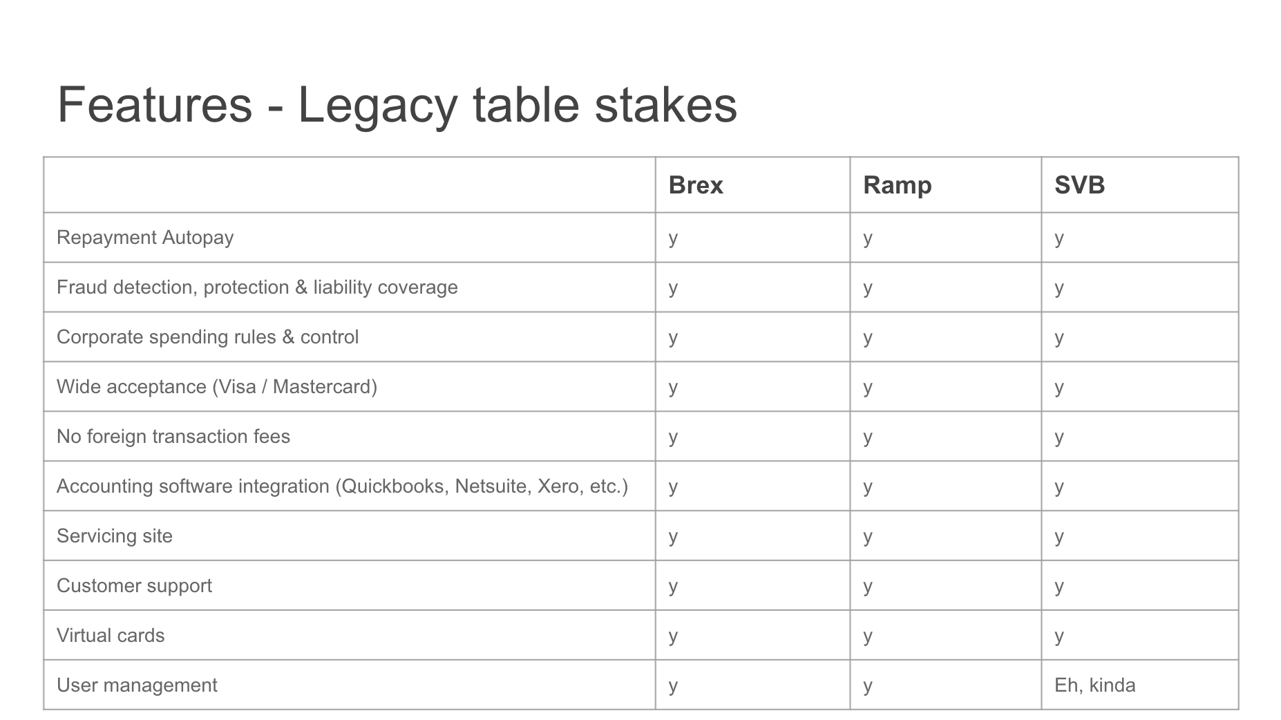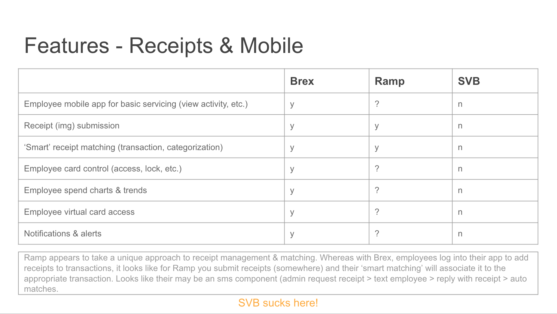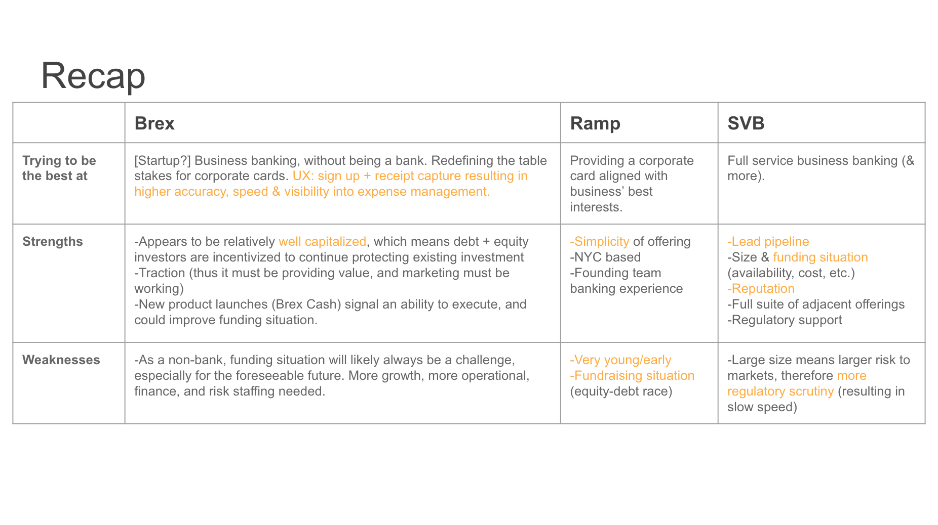 These are the types of questions that need exploring to gain an understanding of the space. Most of my experience is in consumer credit (both Blispay and Bill Me Later/PayPal Credit were B2B2C businesses). I have no experience in the business lending space, so going through the thought exercise to tie corporate cards to expense management in the Background section was critical in helping me understand the big picture. Digging into the competitive landscape is an extension of that.