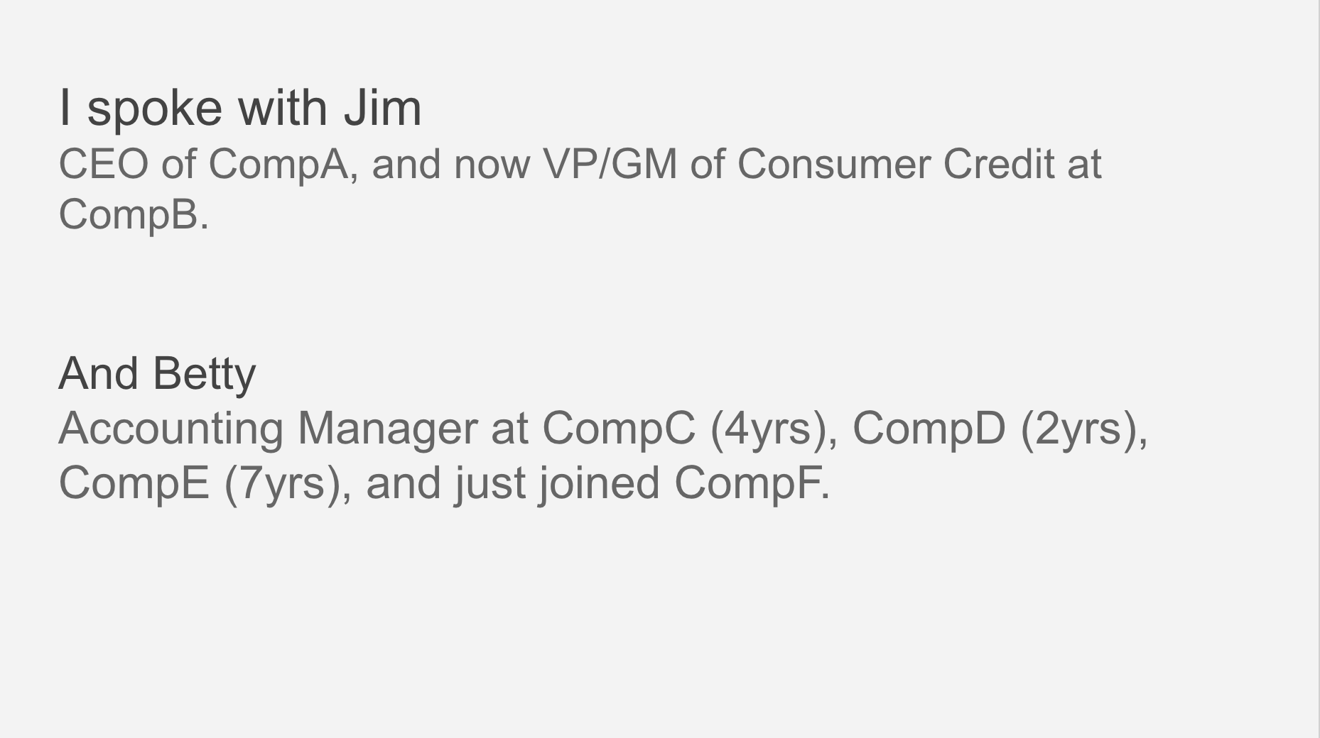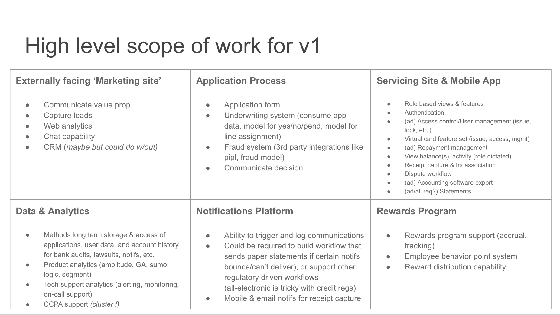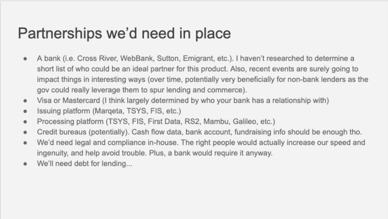 That seems like a solid yet simple outline despite lacking some super important elements you’d want to consider if this was more than just an illustrative example– namely finance & risk. As I said, I’m a generalist. I ground everything in rationality and common sense. I rope together all of the pieces and I’m the pacesetter. But I’m not the expert in every area, or potentially any area at all. Financial services, and specifically credit, are complex so there’s a lot of specialization across an organization. I’ve worked with many who are incredible in this area (like Mike Ritchie) who I’d work closely with on a project like this if it were more than just a fun exercise.