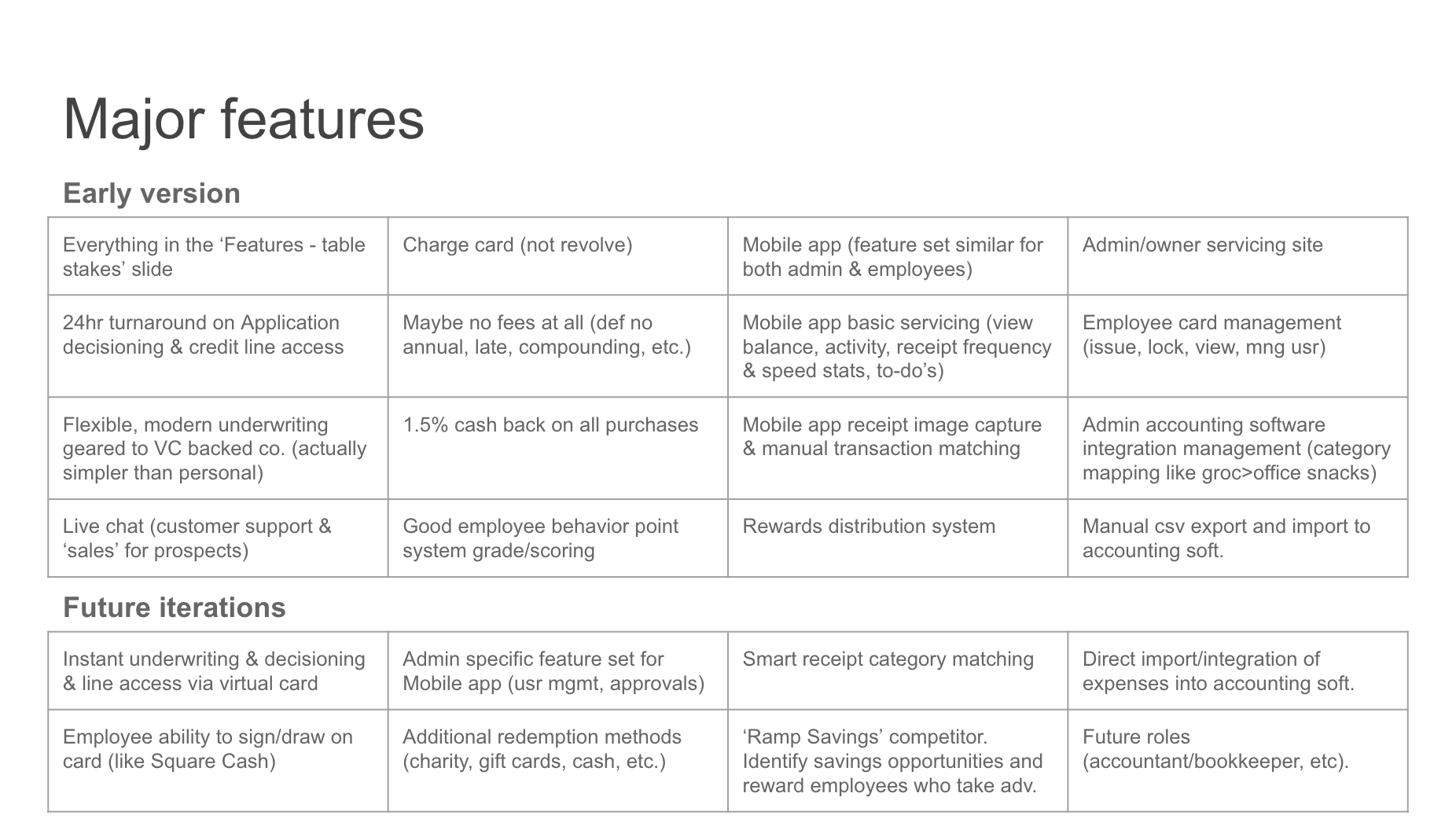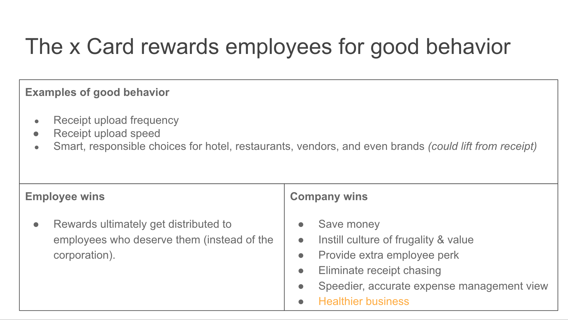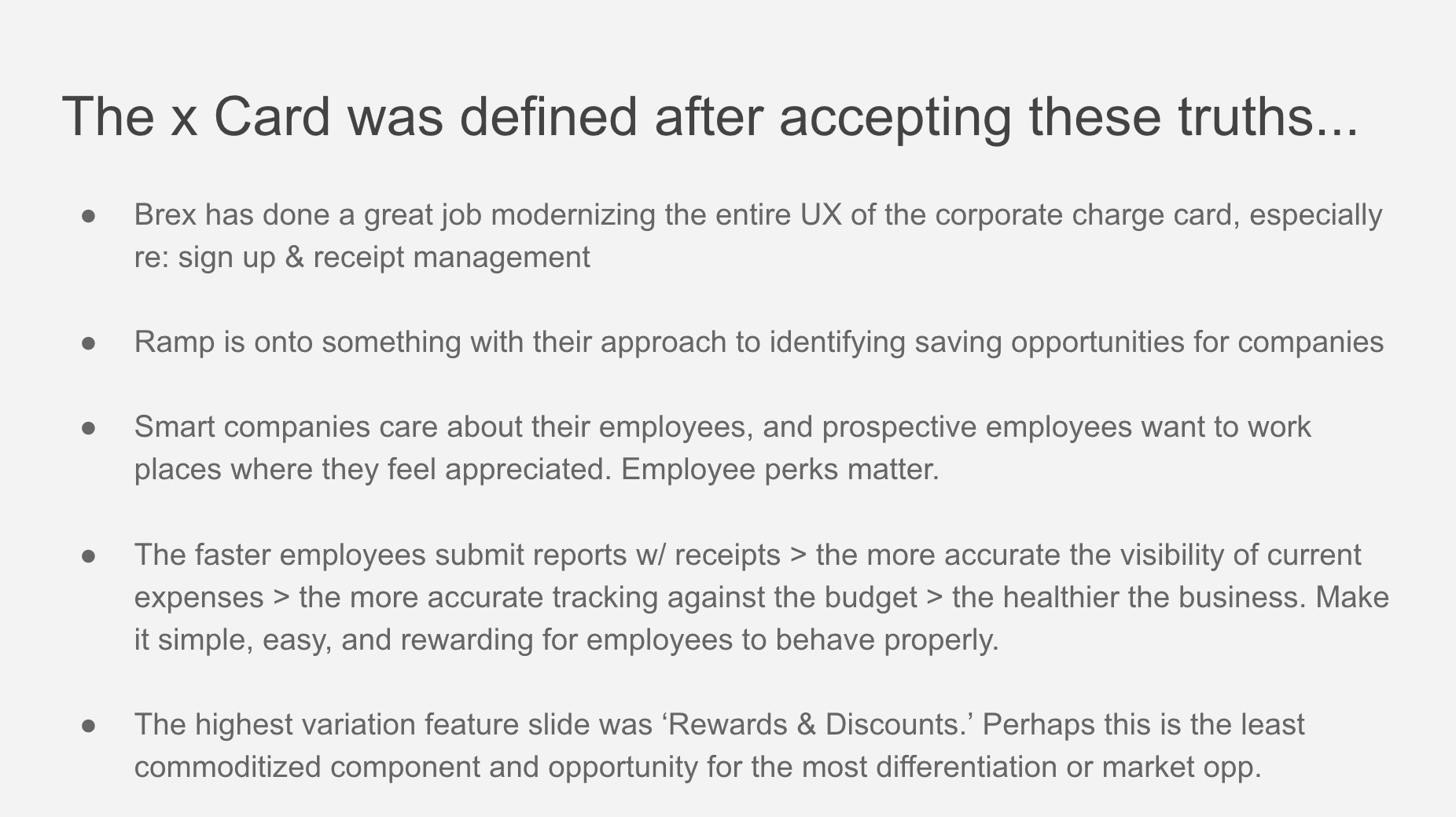 Disclaimer: I’m hoping my Twitter friends like Charley Ma take it easy on me when they see this. This is just meant to serve as an illustrative example– more Product Management than “Fintech.” I’ve never worked on corporate cards so all of my output is based on a weekend of light research. In no way am I claiming that the company or product details are 100% accurate. This was just an exercise completed within the time-box of a single weekend.