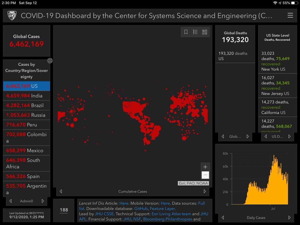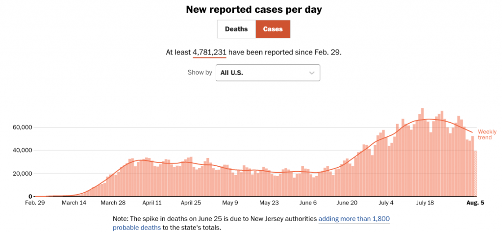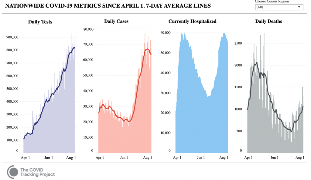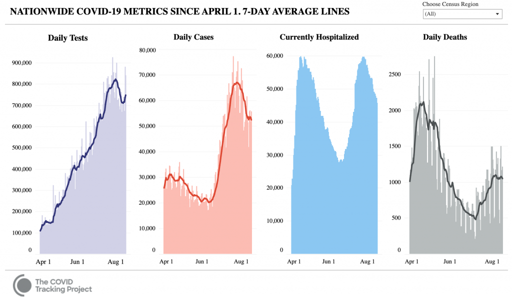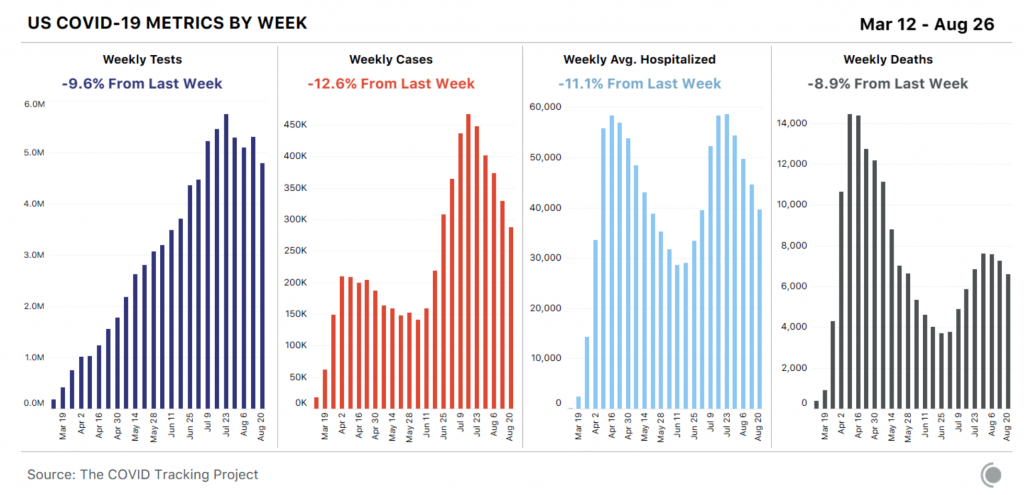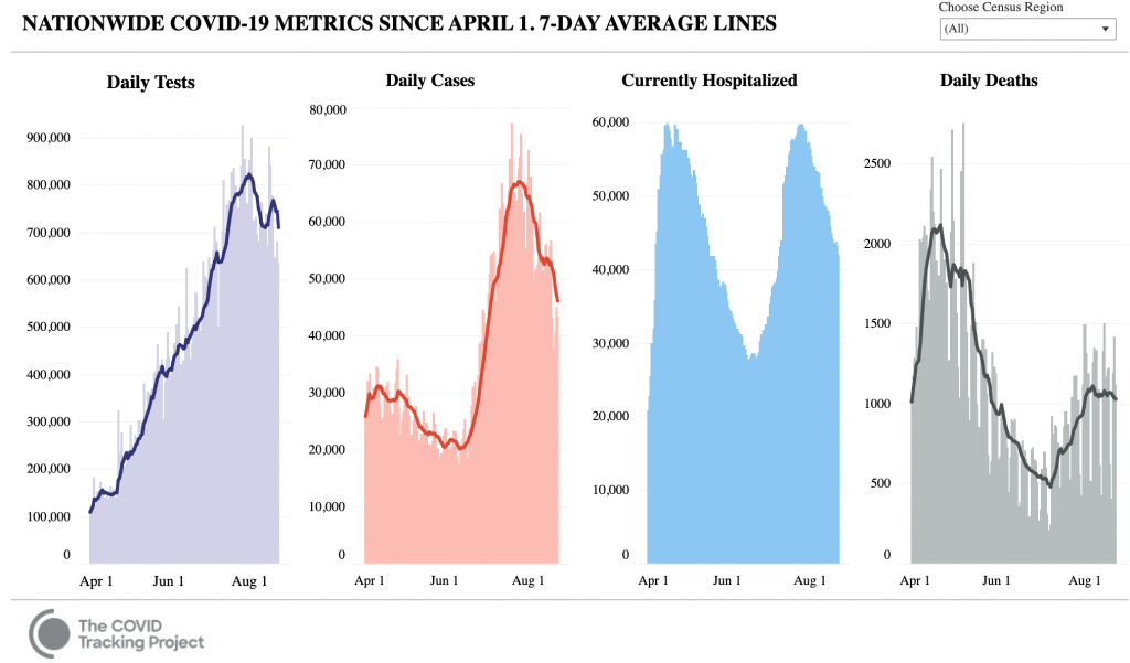 Covid Tracking Project published their weekly post and titled it, The Last Thing We Need Is Fewer Tests. “For the first time since early March, the number of people tested in the United States went down. This week’s tests were 9.1 percent lower than last week’s national peak of 5.7 million tests… As testing declines in many US regions, K-12 schools, colleges, and universities have begun to reopen for in-person classes in many US states, we have already begun to see on-campus and residential outbreaks that mirror those we’ve seen from summer camps. In Hong Kong and Israel, where the pandemic was under greater control than it remains in the United States, school reopenings were followed by spiking outbreaks.”