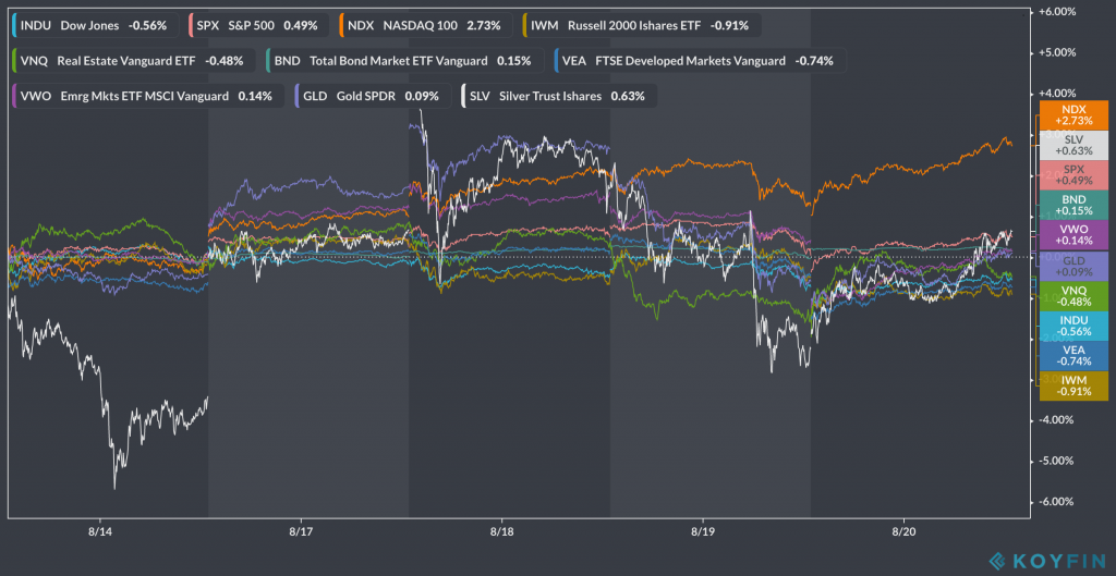 Thursday. The Nasdaq led, closing +1% followed by the S&P 500 +.3%, Dow +.2%, and the Russell 2k which dropped -.5%. Silver is up 1.1% and Gold is up .6%. Tesla crossed $2,000/share. Here’s what the week looks like so far: