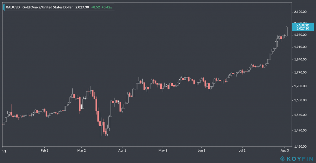 Tuesday. More green. The Russell 2k led, closing +.7%, followed by the Dow +.62%, and the Nasdaq and S&P 500 +.35%. $GLD increased 2% and $SLV flew 6.6%. Spot gold hit $2,000/oz for the first time.