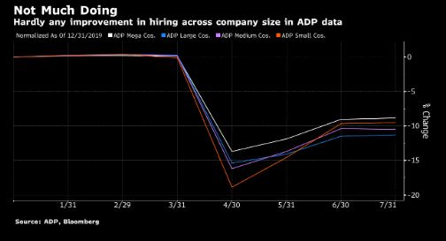 An ADP jobs report today was bleak. “ADP said companies added 167,000 jobs in July, far short of the 1.2 million economists polled by FactSet expected. That follows bigger gains in June and May, when employers added a total of 7.6 million jobs.”
