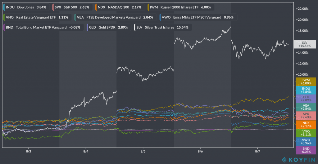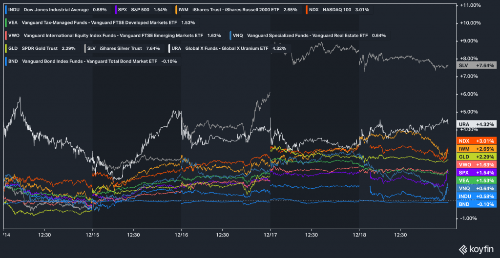 Thursday. The Nasdaq closed +1%, Dow +.68%, S&P 500 +.6%, and the Russell 2k lagged a bit, closing -.1%. $GLD rose another 1.3% to $193 and $SLV flew another 7.3% to nearly $27– the highest since 2013.