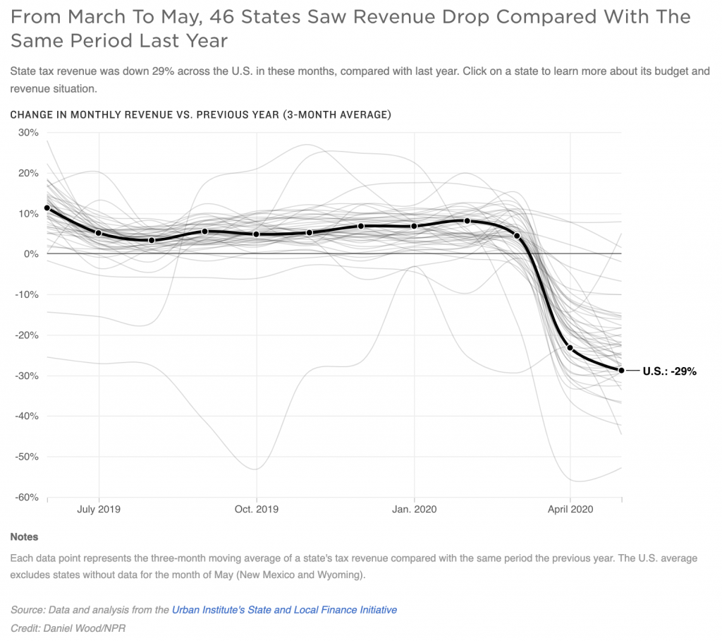 NPR published States Are Broke And Many Are Eyeing Massive Cuts. Here’s How Yours Is Doing. “Record-high unemployment has wreaked havoc on personal income taxes and sales taxes, two of the biggest sources of revenue for states.”
