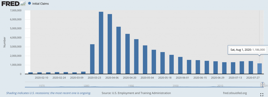 Jobless claims rose another 1.186M. The total since mid-late March is ~55M. For context, the entire GFC of 08-09 saw just over 37M. This was the first weekly decline in almost a month and the lowest claim count since the pandemic rocked life as we knew it.