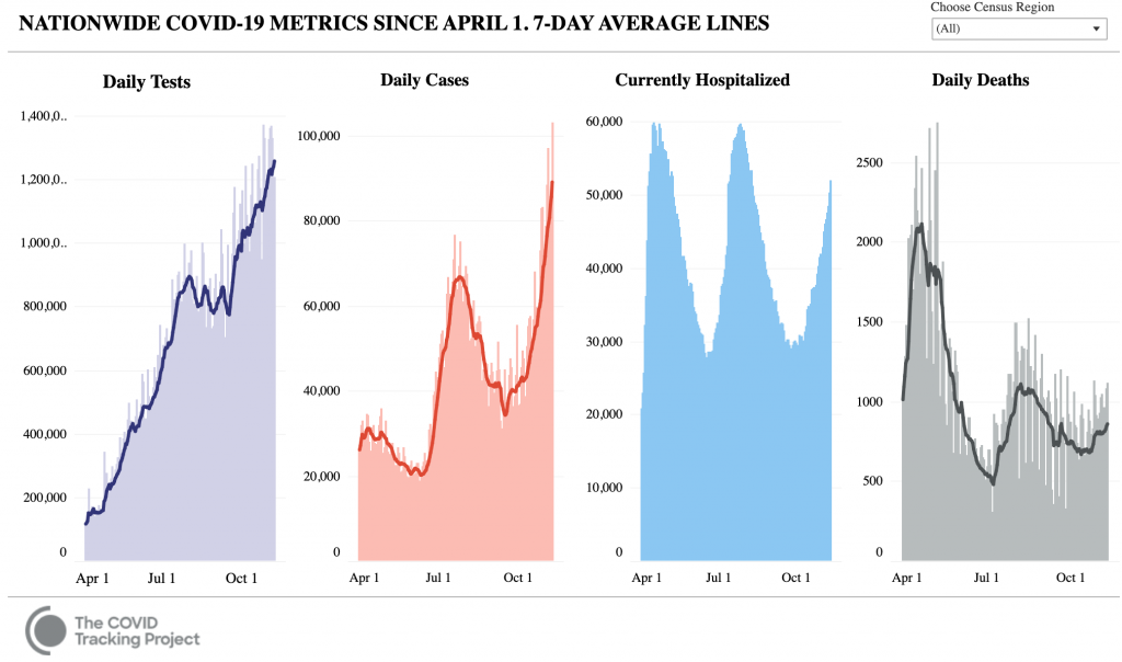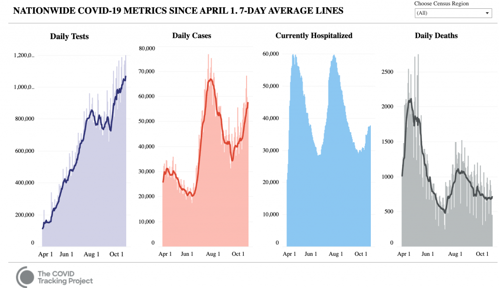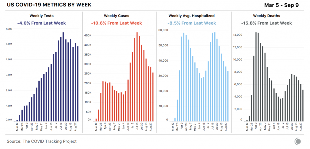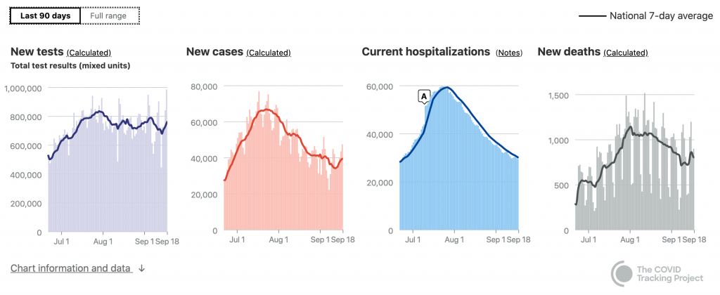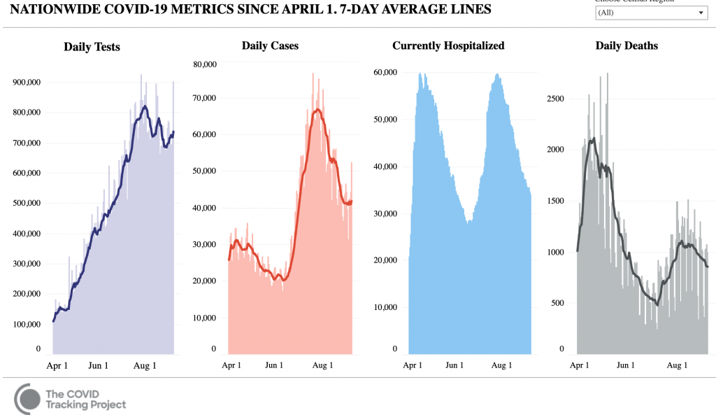 The week’s blog post from COVID Tracking Project is encouraging: Testing Looks Shaky But National Progress Continues. “Though testing across the US can’t seem to regain the peak of late July, we believe conditions on the ground are improving across the country—and that the data states report is, by and large, trustworthy.”