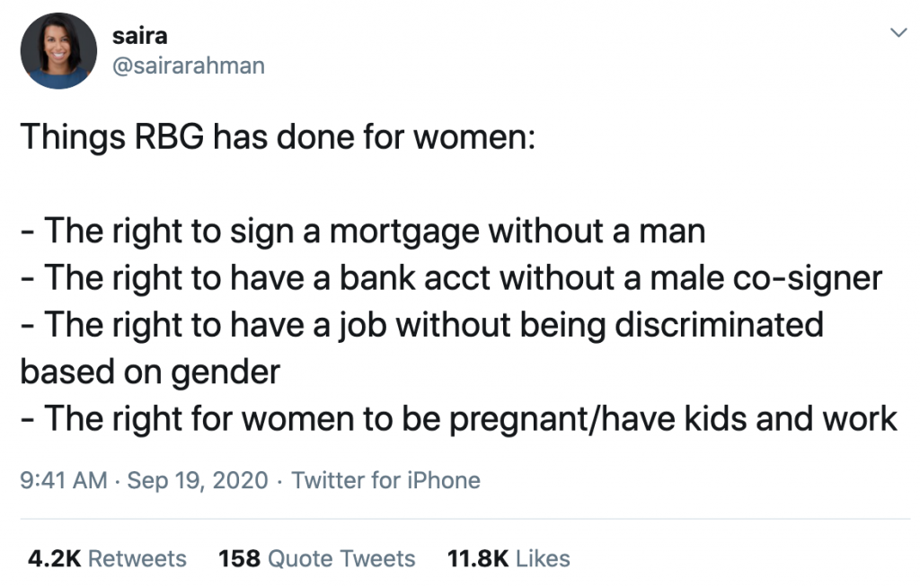 Supreme Court Justice Ruth Bader Ginsburg passed away yesterday at 87 years old. In 2002 she said, “I had the good fortune to be alive and a lawyer in the late 1960s when, for the first time in the history of the United States, it became possible to urge before courts, successfully, that society would benefit enormously if women were regarded as persons equal in stature to men.” Saira Rahman shared: