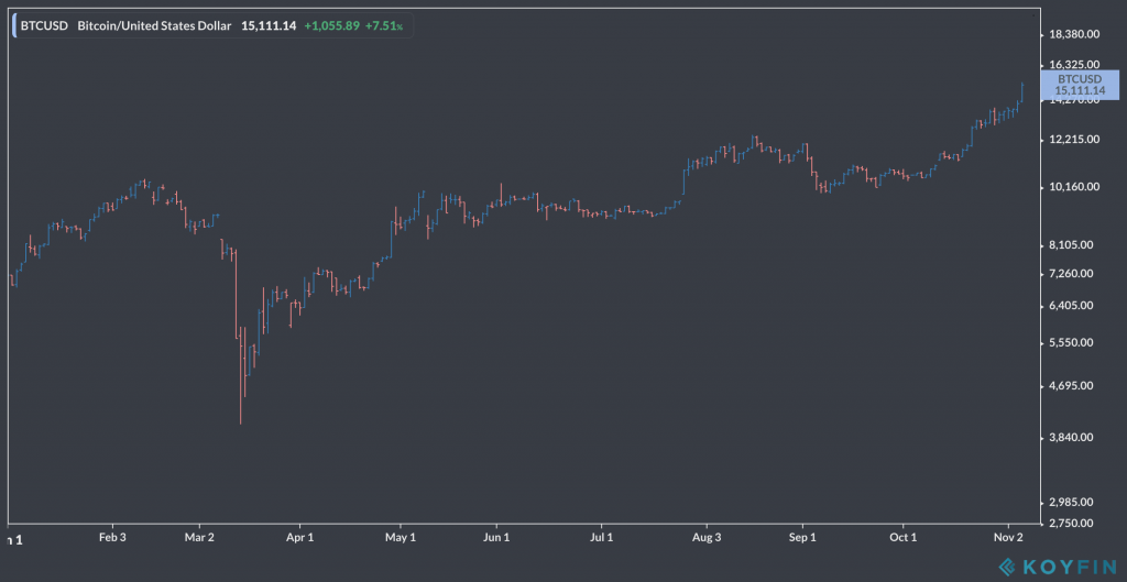Monday. Last day of the month. The day was red but the month was green. The Russell 2k closed the day -1.97%, Dow -.9%, S&P 500 -.45%, and Nasdaq -.06%. $BTC hit an ATH. Coindesk published Bitcoin Price Sets New Record High Above $19,783. “Year to date, bitcoin has gained 167%. Since its yearly lows in March, after crashing more than 50% in a single day, bitcoin has rallied more than 400%.”