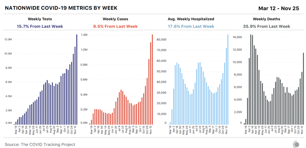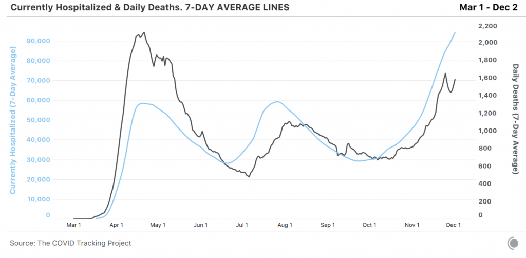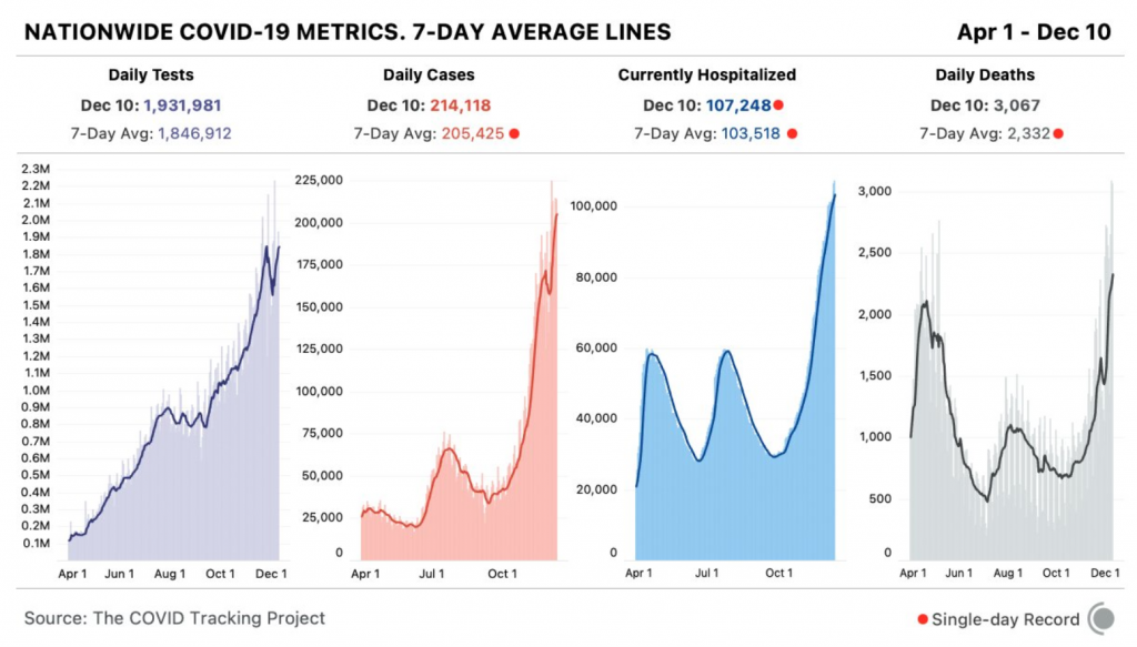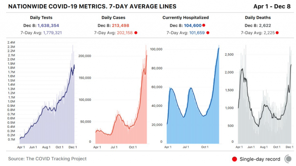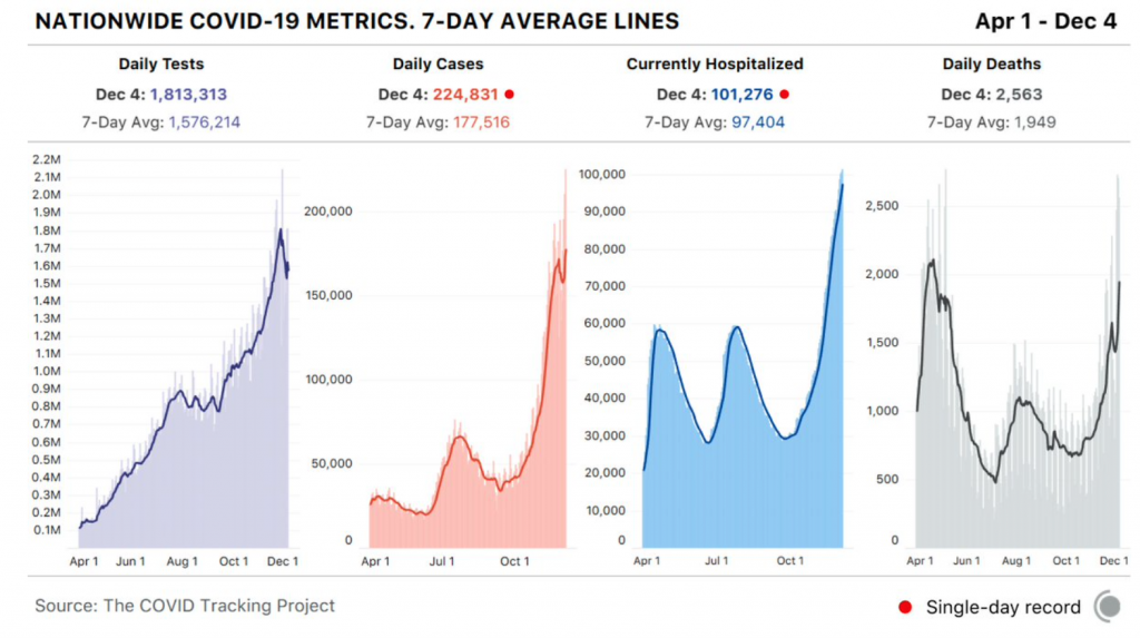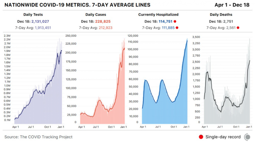From this week’s blog post by The COVID Tracking Project: “December is already the deadliest month since the beginning of the pandemic in the United States.” January will inevitably be even worse given the amount of traveling taking place for the holidays.